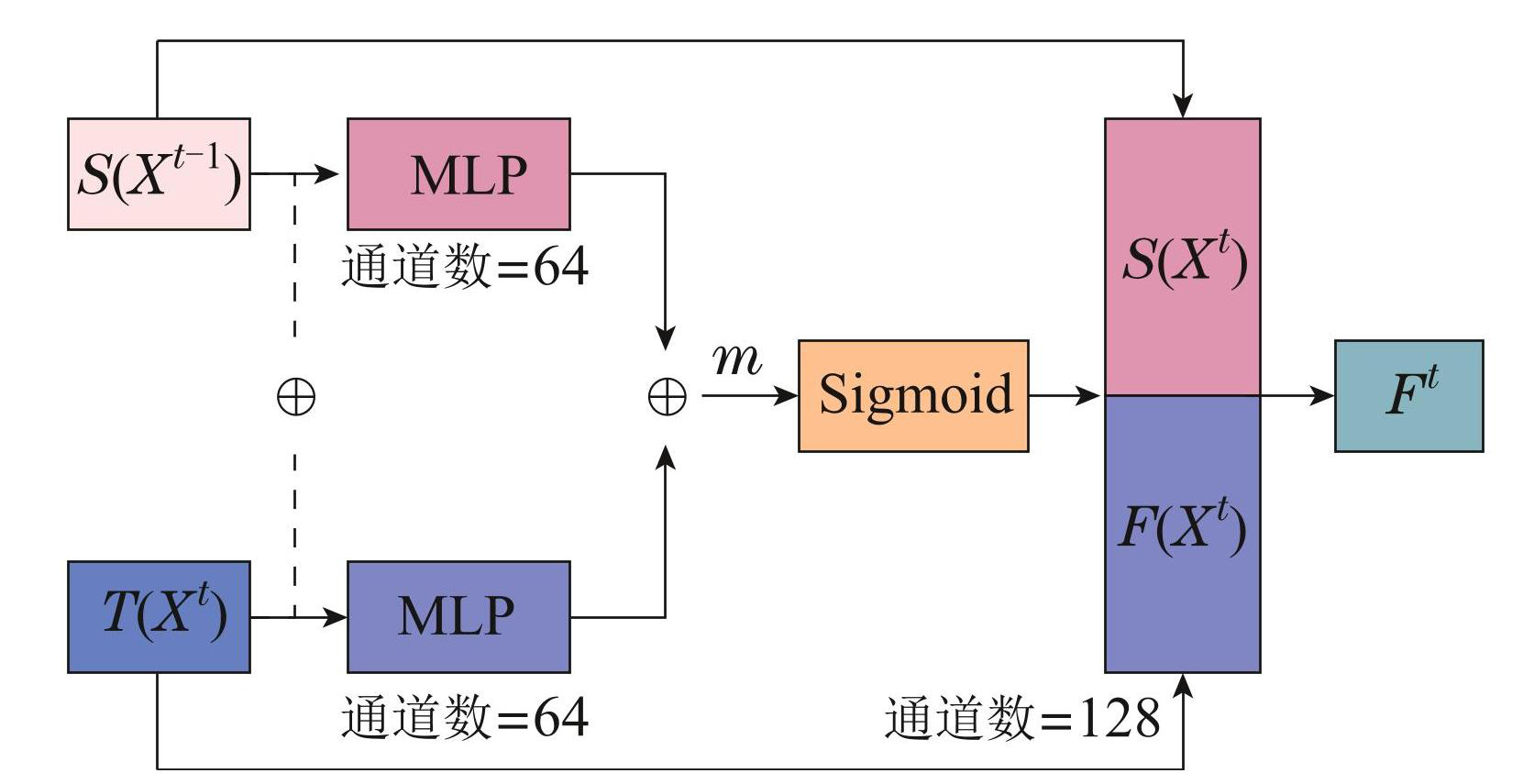 其中: Γ(·)代表mask操作,表示张量(tensor)拼接操作. 局部时空特征具体融合过程为: 首先分别对时间局部特征Tt和空间局部特征S t−1进行批次归一化处理,一方面通过⊕对时空特征直接进行预融合,另一方面通过MLP并行式处理时空特征,利用⊕矩阵求和后进行mask操作,以此屏蔽影响力度小的特征信息. 最终将第K层时刻的输入n与图拓扑结构信息构建的时空特征融合单元进行模块堆叠,对于每一个时空融合特征模块的输出都进行了归一化处理,加快网络训练过程中的收敛速度与网络稳定性. 对于K层的时空特征输出作为第K+1层的时空特征模块的输入(实验中K = 3),通过在网络中叠加这样模块达到特征融合增强学习的目的,从而获取局部时空特征融合信息.