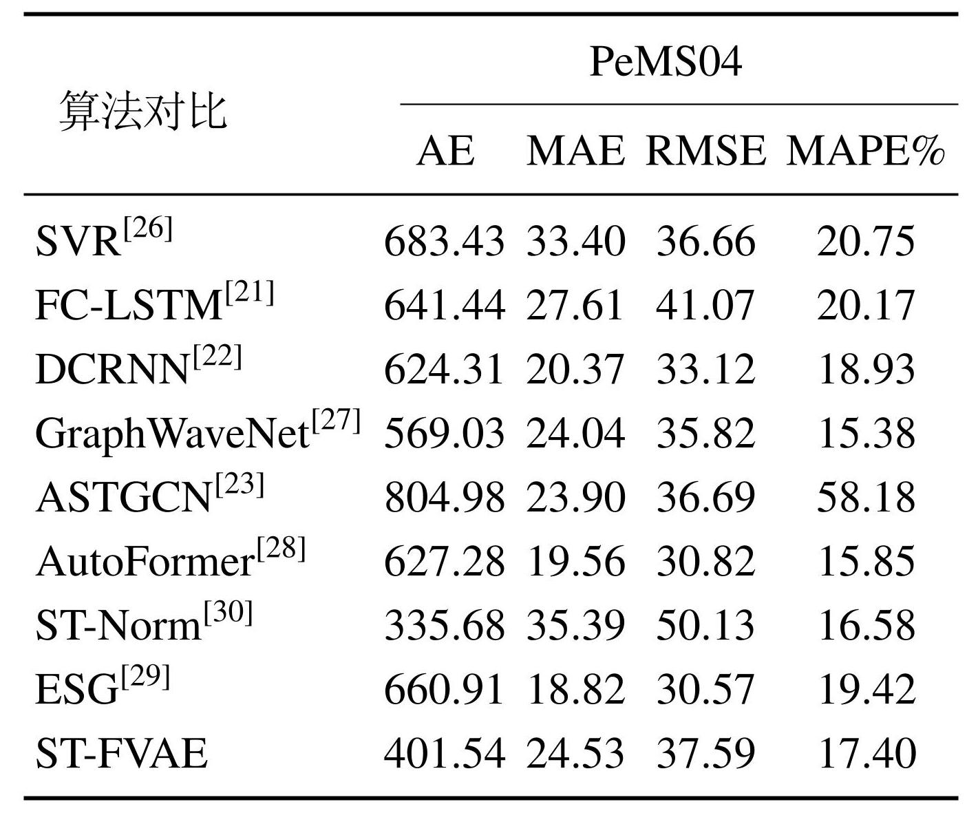 除了对交通流车速的预测之外,为验证ST-FVAE 模型的泛化特性,使用了含流量和速度的数据集PeMS04和PeMS08 进行了训练预测. 表2–4分别呈现了在PeMS04上15,30 min和60 min的流量预测对比情况,表5展示了在PeMS08上进行60 min的流量和速度预测指标值.