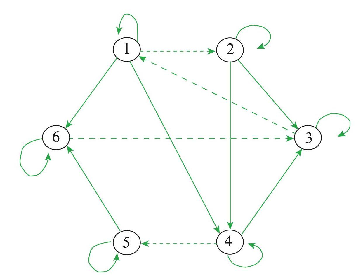 为了更好地理解,利用文献 [10] 中的实例进行说明. 考虑6个人在讨论两个相关的话题,例如,鱼和鲑鱼,鱼包含鲑鱼. 网络拓扑结构如图1所示,其中: 实线表示合作关系,虚线表示竞争关系. 权重矩阵W为 [29]