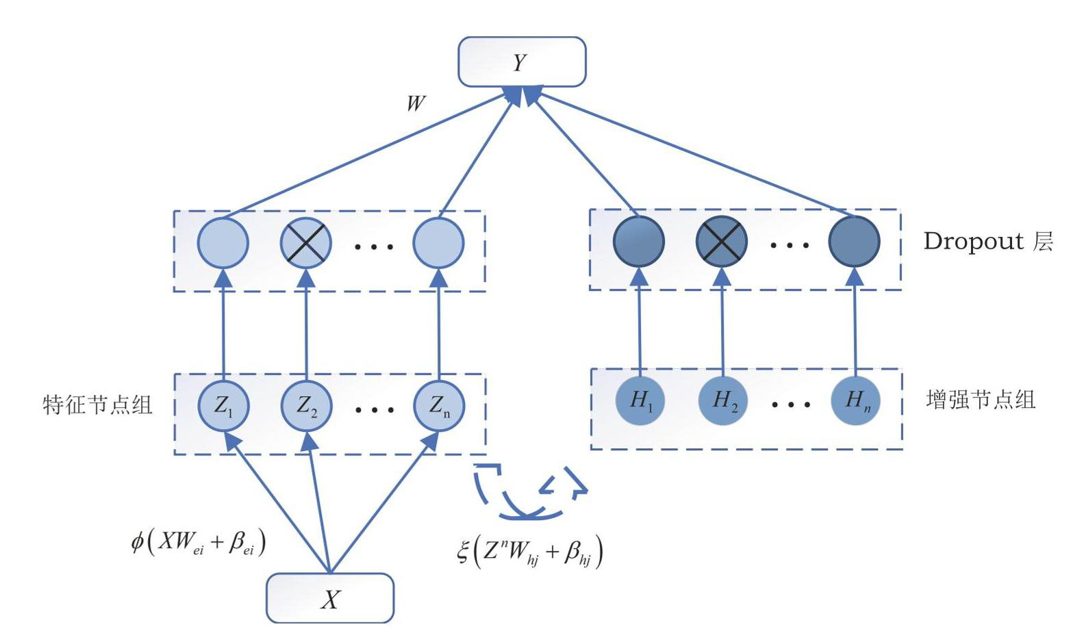 近年来,宽度学习得到了国内外诸多学者的关注. Jin等人 [5] 提出了一种基于L1范数和L2范数正则化方法的鲁棒性宽度学习系统,有效减少了BLS隐藏层节点的冗余,提高了算法的鲁棒性,但该方法最主要是为提升算法的鲁棒性,对BLS结构的精简程度仍稍显不足. 为进一步精简BLS的网络结构,褚菲等人 [6] 提出了一种基于lasso和elastic net的宽度学习系统,并证明了其在网络稀疏上的可应用性. 考虑到BLS的随机映射对输出结果的影响,Wang等人 [7] 通过改变BLS模型的初始随机映射权重分配方法提出了GBLS,进一步提高了模型的数据处理能力,但仍对数据的特征提取程度不够. Cao等人 [8] 提出了一种带有混合特征的BLSHF算法,用不同的分布来初始化每个组中的映射特征节点,从而增加映射特征的多样性,可以实现比BLS更好的泛化能力,但也带来了冗余特征. 相较于只向“宽度”方向构造的改进宽度学习系统,其 “深层”结构有助于提高BLS的精确性. Liu等人 [9] 为解决BLS的浅层结构对于其算法能力的限制,提出了一种具有动态结构的堆叠宽度学习系统Stacked BLS. Zhang等人 [10] 深入分析了BLS快速增量学习的原理,根据深度神经网络的新结构设计理念在级联结构的基础上分别结合金字塔结构、Dropout操作和密集结构提出了四种全新的BLS变体及其增量实现,有效提高了BLS的输出准确性,但该方法只是“机械”的将级联宽度学习系统与Dropout操作结合起来,没有考虑到Dropout算法对节点丢弃后对输出精度的影响.