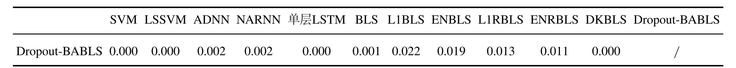 为了进一步比较Dropout-BABLS相较于其他算法的优越性,本节对各算法的训练时间进行了Friedman post-hoc test检验,结果如表4所示. 结果表明,相较于传统机器学习算法和神经网络前沿算法,Dropout-BABLS 在显著性水平0.01条件下具有显著差异,可以认为Dropout-BABLS在节约训练成本上具有显著优势. 对于BLS及DKBLS两个算法来说,Dropout-BABLS也能在0.01水平条件下通过显著性检验,说明Dropout-BABLS能极大程度减少宽度学习系统的隐层节点数量而不降低模型的输出精度. 对于L1BLS、ENBLS、L1RBLS和ENRBLS 来说,Dropout-BABLS仅能在显著性水平0.05条件下通过检验,这是由于这四种算法的目标函数均包含L1范数,能够一定程度上稀疏BLS的网络结构,但简化程度相较于Dropout-BABLS而言仍有较大差距.