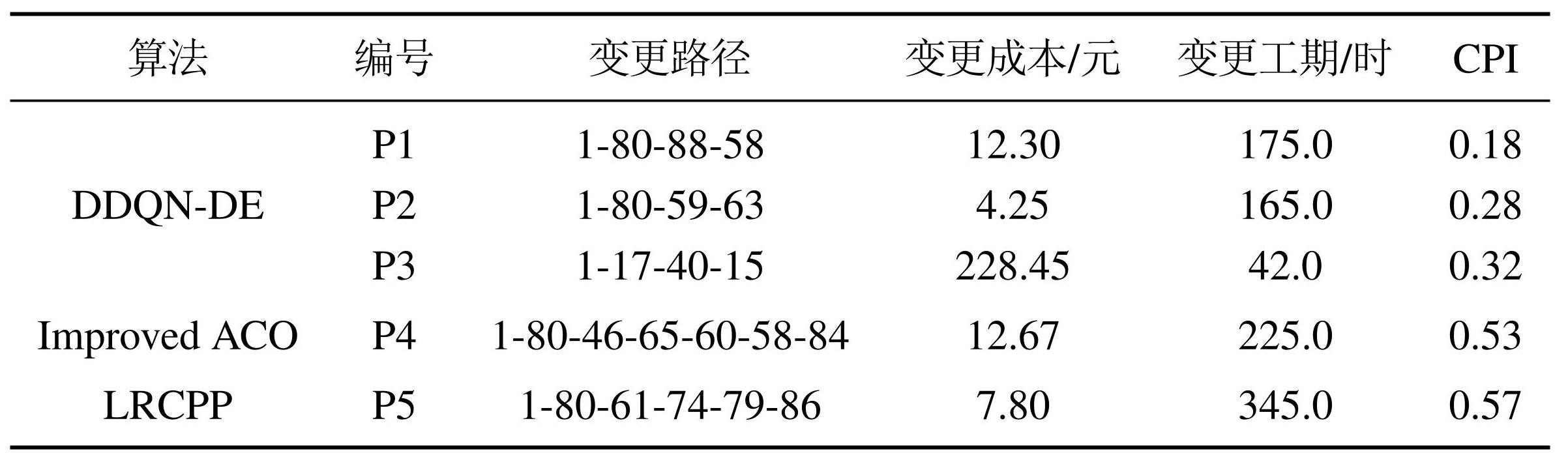 具体路径信息如表4所示,其中P1-P3是从图5的Pareto最优解集中选取的3个变更方案; P4和P5分别是通过Improved ACO和LRCPP算法获得的变更方案. 从实验结果可以看出: 1)相比于Improved ACO和LRCPP算法,DDQN-DE算法能够同时获得多个非劣解.2)DDQN-DE算法获得的方案P1-P3各有优缺点,如方案P1的CPI值比P2,P3的CPI值小,即变更对产品综合性能影响更小; 方案P2的变更经济成本优于P1和P3; 方案P3的变更工期优于P1,P2.3)在DDQN-DE算法所得非劣解中,皆存在一个解支配ImprovedACO和LRCPP算法得到的最优变更传播路径. 例如,DDQNDE算法所得解P1支配Improved ACO的解P4,DDQNDE算法所得解 P2支配LRCPP的解P5. 综上,DDQNDE算法在求解变更方案方面优于Improved ACO和 LRCPP算法,它可以提供多个优秀的变更方案供设计者进行选择.