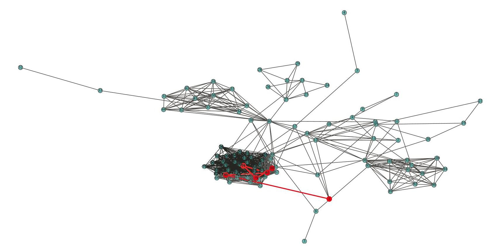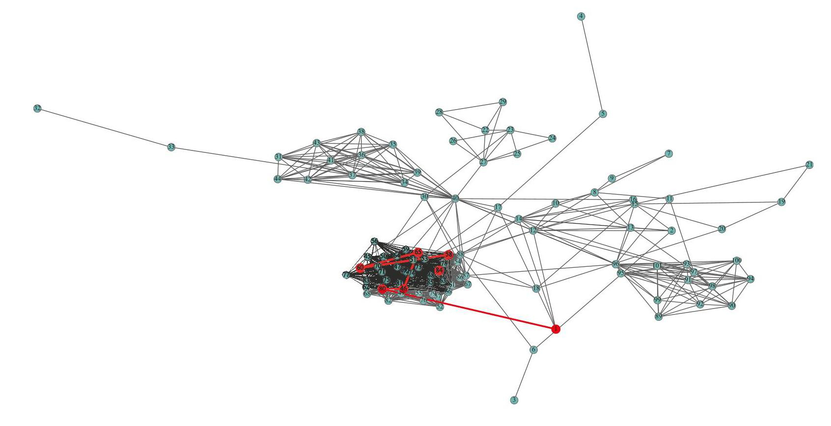 进一步,本节将DDQN-DE算法分别与ImprovedACO算法和LRCPP算法进行对比,验证算法在求解变更方案方面的优越性. 在实验中,选择零件1(电子线)作为初始变更节点; 将3个优化目标值归一化,作为对比算法的优化目标值. 图3和图4中的红色节点分别是通过Improved ACO和LRCPP算法获得的最优变更传播路径. 图5展示了通过DDQN-DE算法获得的Pareto 最优解集.