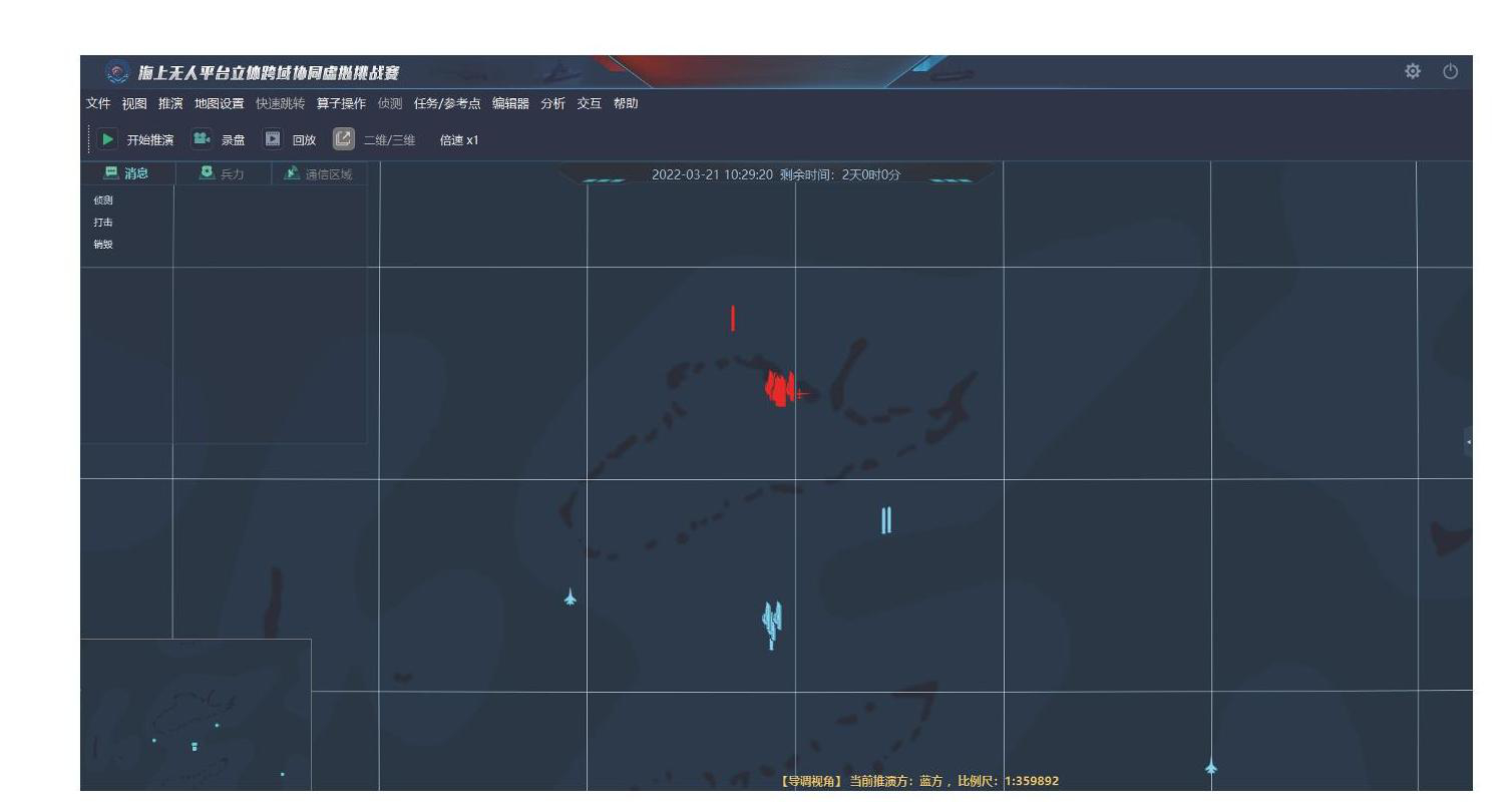 本文选用《2022海上无人平台立体跨域协同虚拟挑战赛》博弈推演平台进行实验验证,综合运用无人机、无人艇、无人潜航器集群,进行红蓝对抗,检验所提ASM2算法的指挥决策能力. 该平台提供可视化前端界面和python接口,与后台管理程序通信获取作战单元相关信息,图4为博弈推演平台示意图.