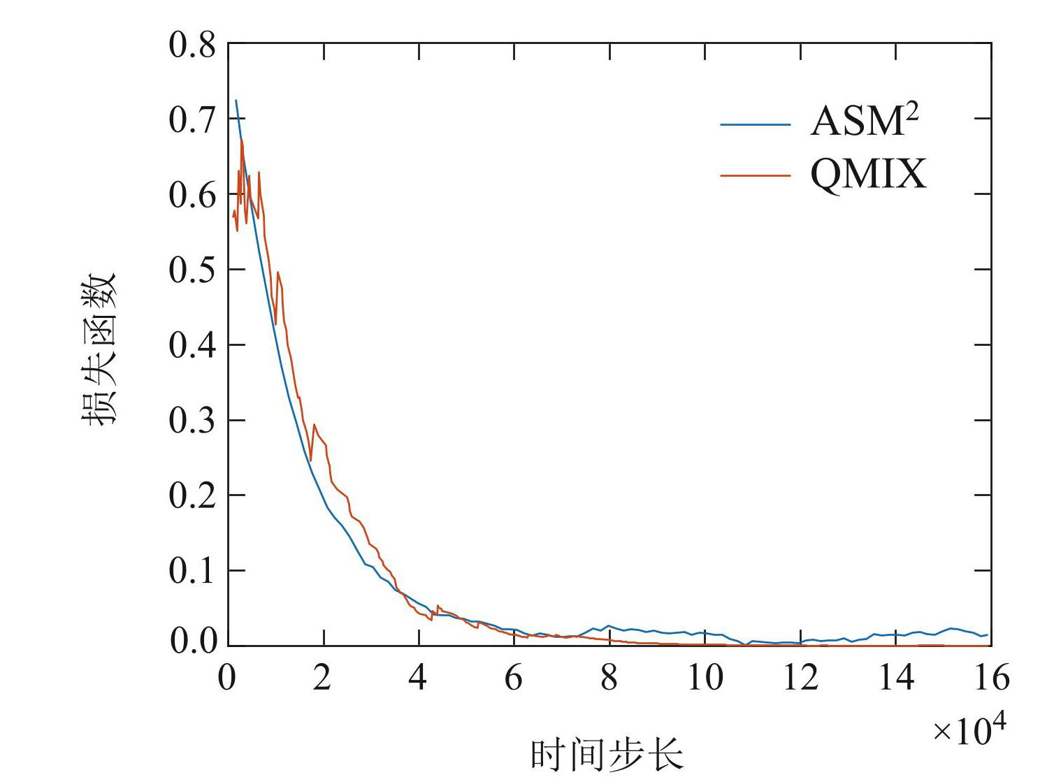 训练过程中ASM2算法和QMIX算法损失函数曲线如图5所示,其中: 横轴为时间步,纵轴为损失函数值. 随着训练的进行,两种算法的损失函数都呈现震荡下降的趋势,并向零逐渐逼近,说明网络预测值与真实值之差慢慢减小,训练有效.