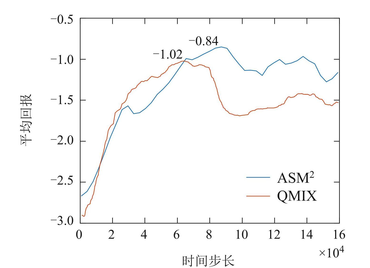 ASM2 算法和 QMIX算法平均回报曲线如图6所示,其中: 横轴为时间步,纵轴为平均回报. ASM2算法的平均回报随着训练轮次的增加总体呈现上升趋势,上升峰值达到−0.84,最后在−1上下波动,说明训练在朝着正确的方向进行,智能体博弈水平在不断提高; QMIX 算法的平均回报上升峰值为−1.02,最后在 −1.5上下波动. 与QMIX算法相比,ASM2算法训练效果更好,更加稳定.