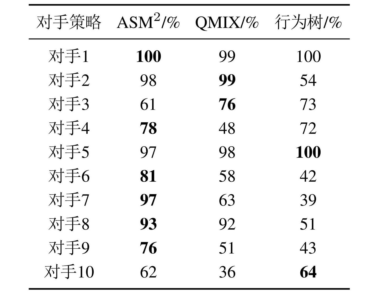由表9可知,对于对手1,2,5,7,8,训练后的ASM2 算法模型都能保持超过90%的极高胜率; 对于对手3,4,6,9,10,ASM2算法模型都能保持超过60%的较高胜率. 经对比,观察到QMIX算法在特定场景,如与对手3的对抗中,其胜率超越了ASM2算法; 同样地,基于行为树的专家规则方法在与对手5的交锋中表现出了卓越的胜率,这些结果揭示了不同算法在特定策略对抗中的潜在优势. 但总体而言,ASM2算法在多数对手策略上都维持了较为稳定的胜率,证明其具有广泛的适应性和较高的博弈水平.