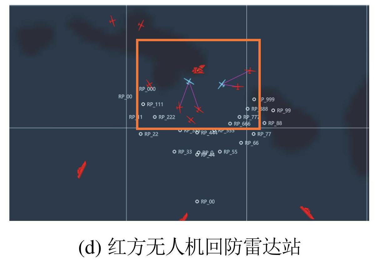接下来,通过一组序列图具体分析所提算法与蓝方对手策略8的对抗效果. 如图7所示,蓝方对手策略 8先发射导弹击毁红方两架察打一体无人机,随后派遣30架自杀式无人机以三机十编队前进. 红方ASM2 算法模型派遣察打一体无人机在雷达站下方区域巡逻,先发射导弹攻击右方编队,再按从右到左的顺序用激光武器歼灭无人机编队. 蓝方无人机靠近雷达站后,红方无人机回防,成功守住雷达站.