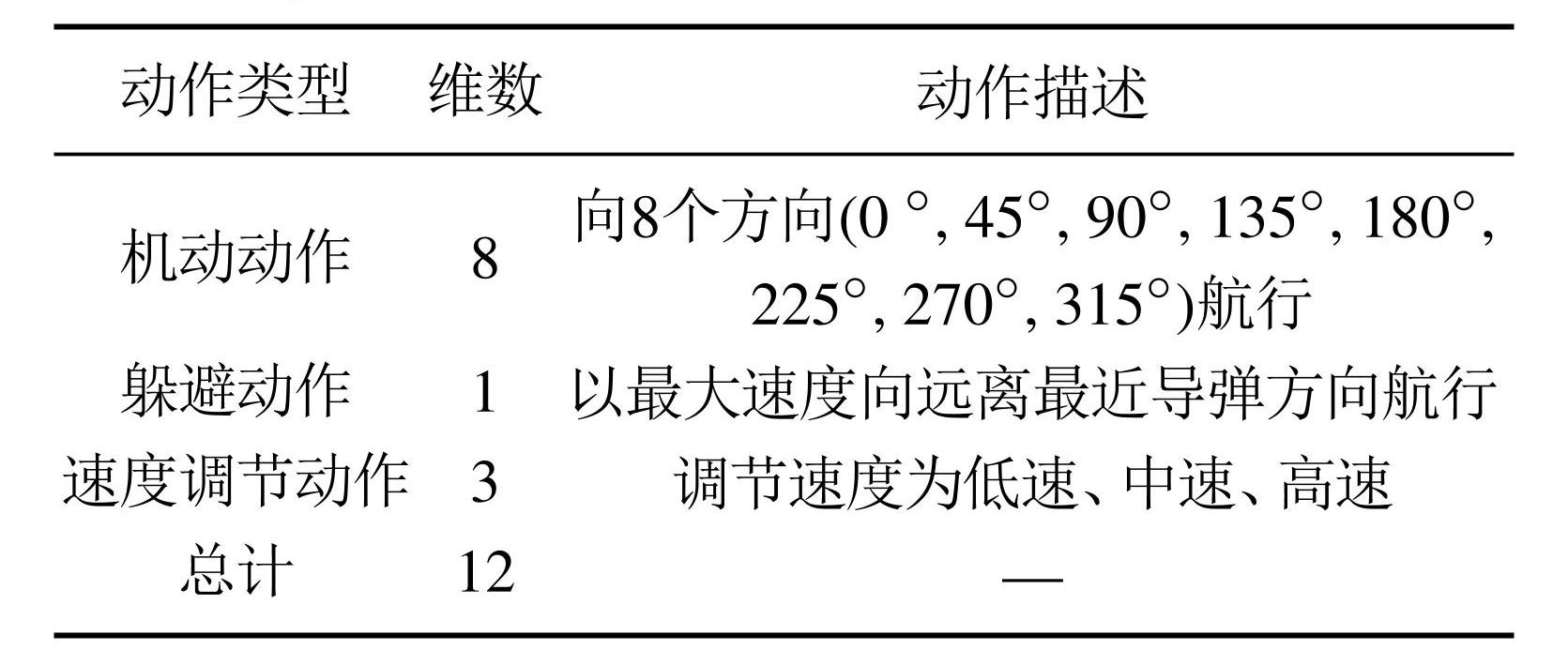 在涵盖多种作战单元的情形下,为增强各类作战单元的机动性和灵活性,提高智能体的操作上限,针对飞机F、舰船V 和潜艇U智能体,设计异构多智能体离散动作空间. 对于飞机智能体F,动作空间包含机动、躲避、速度调节、高度调节共15维动作; 对于舰船智能体V 和潜艇智能体U,动作空间包含机动、躲避、速度调节共12维动作. 其中机动、躲避动作如图1所示,各作战单元动作空间设计如表4–5所示.
