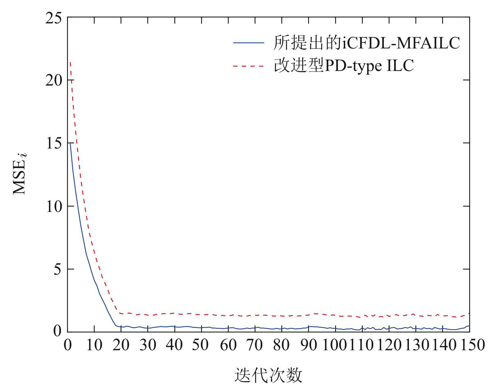 定义如下数量指标均方误差(mean squared error,MSE),刻画每次迭代的速度误差均方差,用于评估在整个实际运行时间区间上的控制性能. 本文所提iCFDL-MFAILC算法和改进型 PD型ILC算法的速度误差均方差仿真如图7所示. 从图中可以看出,本文方法相比于改进型PD型ILC算法具有更好的跟踪效果.