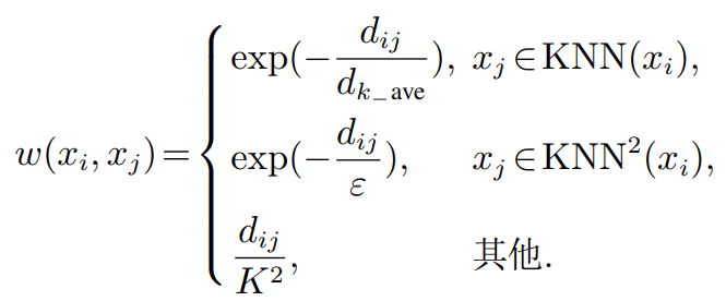 w(xi ,xj)为样本与的关联度,将样本间的关联关系分为3种情况: 1)样本xj为xi的K近邻,此时样本间的关联度最高; 2)样本xj为xi的二阶K近邻(不属于 K近邻),关联度次之; 3)样本xj不属于xi的K近邻和二阶K近邻集合,关联度较小.