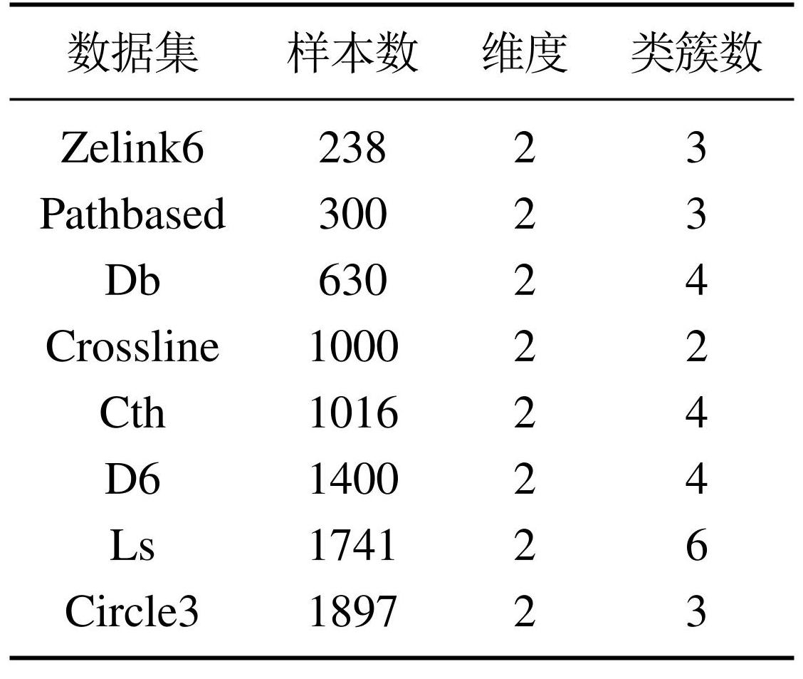 为克服DPC算法的缺陷,近年来,学者们做了大量的研究工作,并提出多种改进算法. 针对DPC局部密度定义存在的问题,Zhao等 [12] 结合近邻模糊核函数提出面向密度分布不均数据的模糊与加权共享近邻密度峰值聚类算法(density peaks clustering algorithm based on fuzzy and weighted shared neighbor for uneven density datasets,DPC-FWSN),该算法在计算样本局部密度时考虑了样本的邻域信息,能够平衡各类簇样本密度的贡献,有助于算法选取正确的类簇中心. Zhou等 [13] 提出一种基于核心点识别和KNN核密度估计的鲁棒聚类算法(a robust clustering algorithm based on the identification of core points and KNN kernel density estimation,ICKDC)算法,利用 KNN思想提出一个新的密度估计方法,更容易表征类簇样本的分布差异. Li等 [14] 提出一种基于模糊语义单元的密度峰值聚类算法(an approach of fuzzy semantic cells to density peaks clustering,DPC-FSC)算法,该算法将数据集的样本作为模糊点的模糊语义细胞模型,通过设计合理的粒度原则计算样本的局部密度,将其转化为优化问题. Zhang等 [15] 提出基于平衡密度和连通性的密度峰值聚类算法(density peaks clustering based on balance density and connectivity,BC-DPC)算法,该算法提出的平衡密度设置参数K获取更多的邻域信息,能有效选择正确的类簇中心.