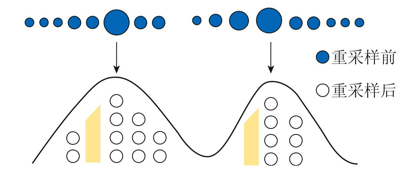 然而在实际问题中,直接从中抽取粒子较为困难,所以在此引入一个较为容易采样的重要性概率密度,并确定粒子权值为