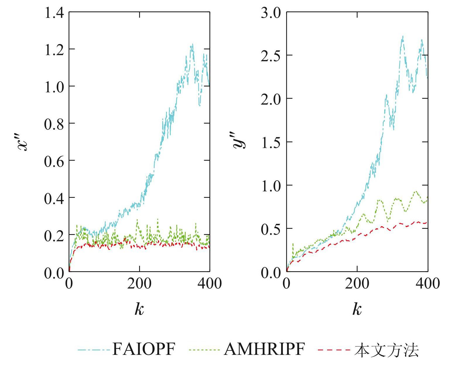 在本次仿真实验中,的初始状态x0 = [60000 50 1450 0 0 − 50 × ϖ2 ] T,机动频率ϖ = 0.2 × π,采样周期T = 0.1 s,仿真步长 L= 400,粒子数N = 100. FAIOPF和AMHRIPF两种算法的参数与参考文献一致.
