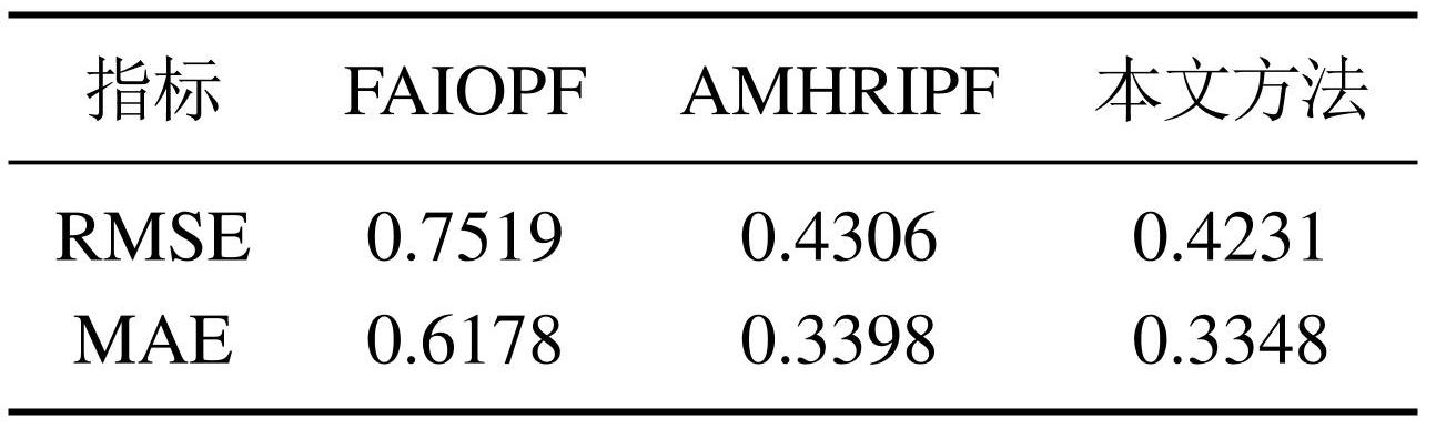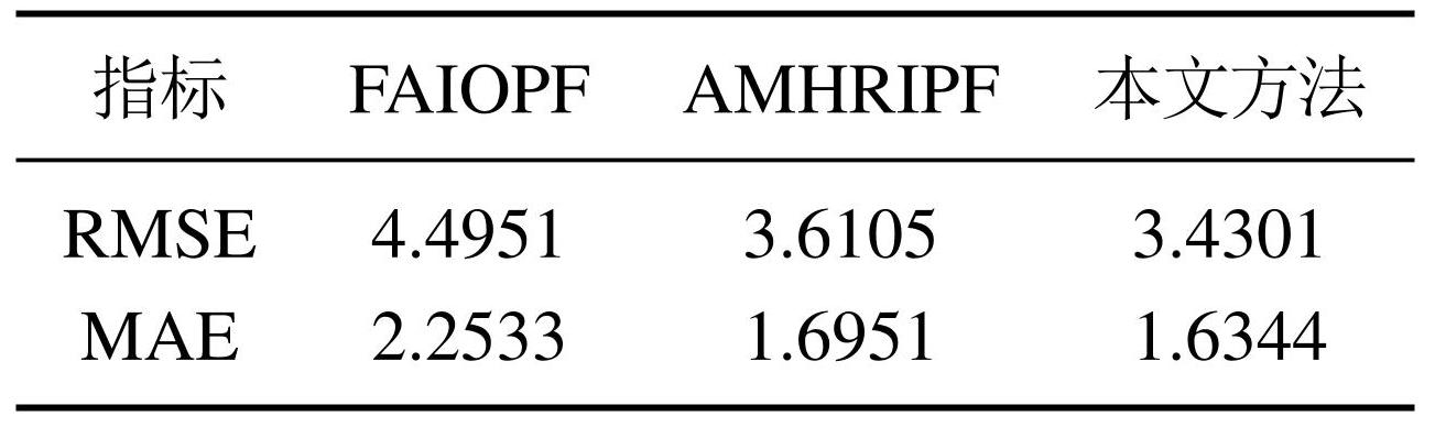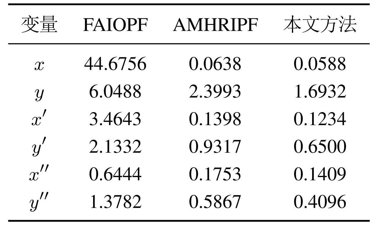 由图6的跟踪轨迹可得,3种方法均能跟踪上真实轨迹. 但从局部放大的图形来看,FAIOPF误差较大,AMHRIPF的误差小于FAIOPF,本文方法的估计结果最接近真实值. 由图7可得,FAIOPF 的 RMSE 大于其他两种方法,而本文方法的RMSE小于AMHRIPF. 由表3和表4可得,本文方法对高维模型位置、速度、加速度估计结果的RMSE和MAE都最小,与FAIOPF和 AMHRIPF两种方法相比,本文方法对高维非线性系统同样具有较好的估计性能.