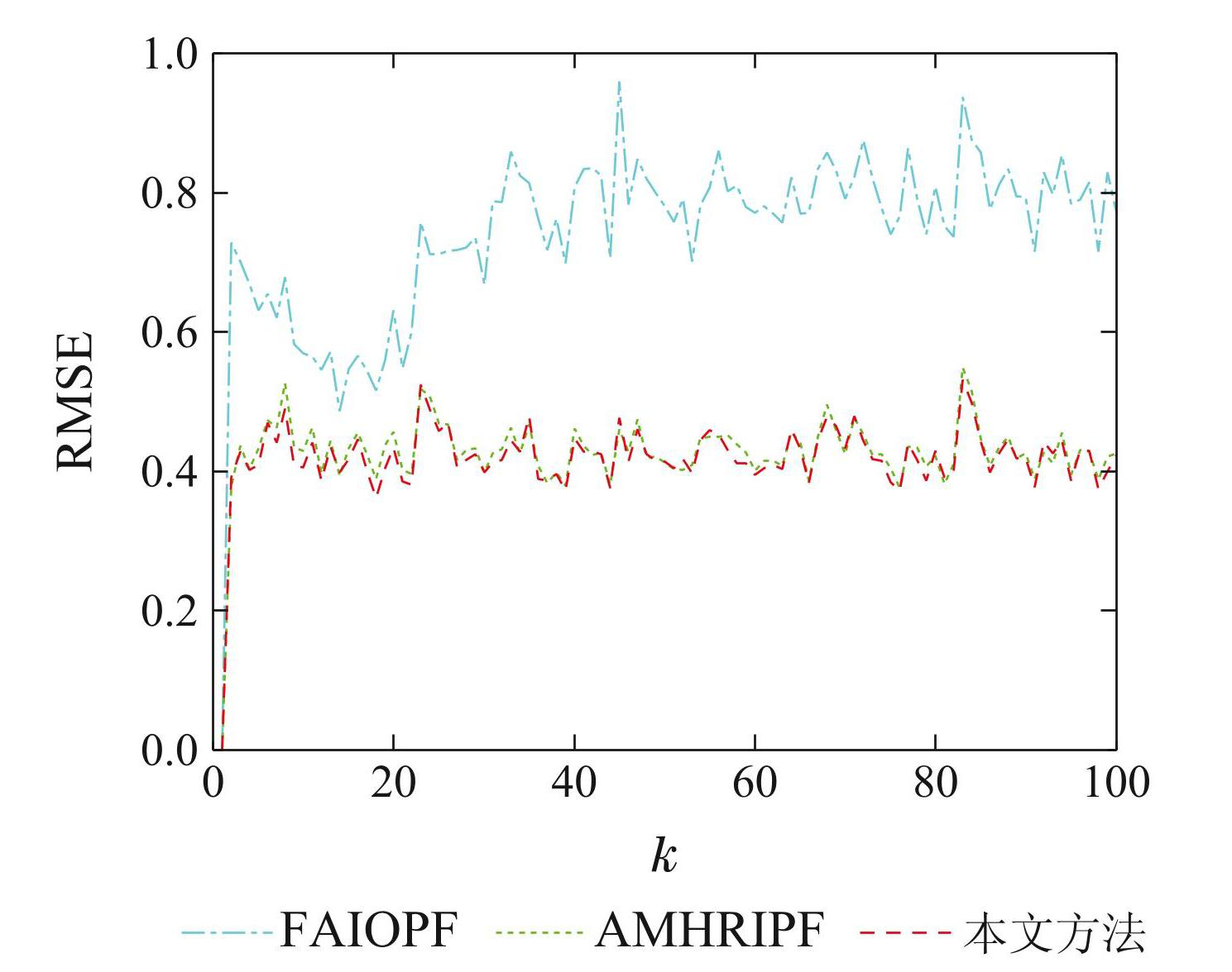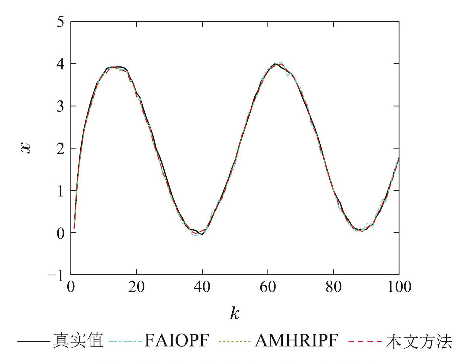 在本次仿真中,过程噪声方差和观测噪声方差均为1,状态初值x0为0.1,时间序列长度L为100.3种算法的状态初值x0均设置为0.1,粒子数为100,FAIOPF和AMHRIPF两种算法的参数与参考文献一致.