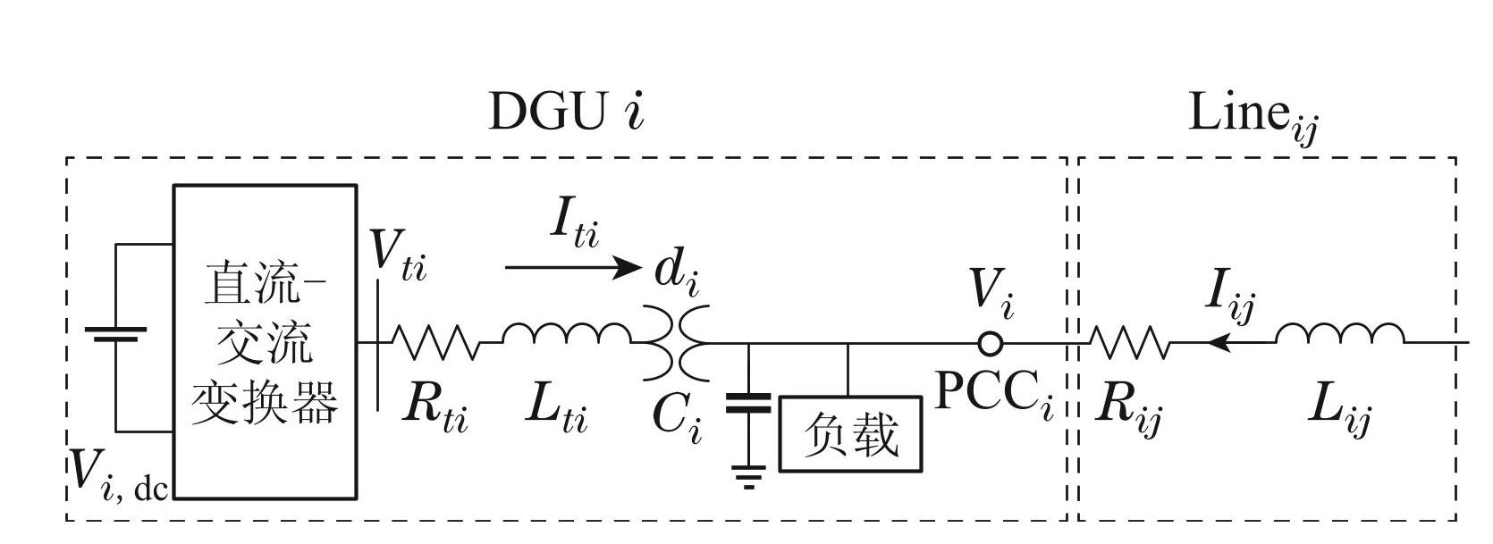 考虑由n个分布式发电单元(distributed generation unit,DGU)组成的可再生能源微网系统,DGU i表示系统中的第i个DGU,其结构示意图如图1所示. 每个 DGU中,直流电压源代表一种通用的可再生能源,其通过直流–交流变换器为负载提供电能,再通过公共耦合点(point of common coupling,PCC)连接到输电线路,各个DGU间通过m条阻性电力线连接. Vti与 Iti分别为直流电压源 Vi,dc 经直流–交流变换器后到 PCCi之间的等效电压与电流,Rti与Lti为串联滤波器的电阻和电感,di为升压变压器的变压比. 假设本地负载未知,将其视为一种电流扰动,通过连接并联电容器Ci来减轻负载造成的高频谐波影响. 可再生能源微网系统拓扑结构通过互联无向图(D,ϕ)表示,其中: D = {1,· · ·,n} 表示拓扑中所有 DGU的集合,ϕ= {1,2,· · ·,m}表示拓扑中DGU 间输电线路的集合,定义Di为DGU i的邻居DGU集合. Iij表示阻抗为Rij 和Lij的三相输电线路Lineij的电流. 根据基尔霍夫定律和Park变换,以ω0为参考速度的两相旋转(dq)坐标系下DGU i的数学模型为