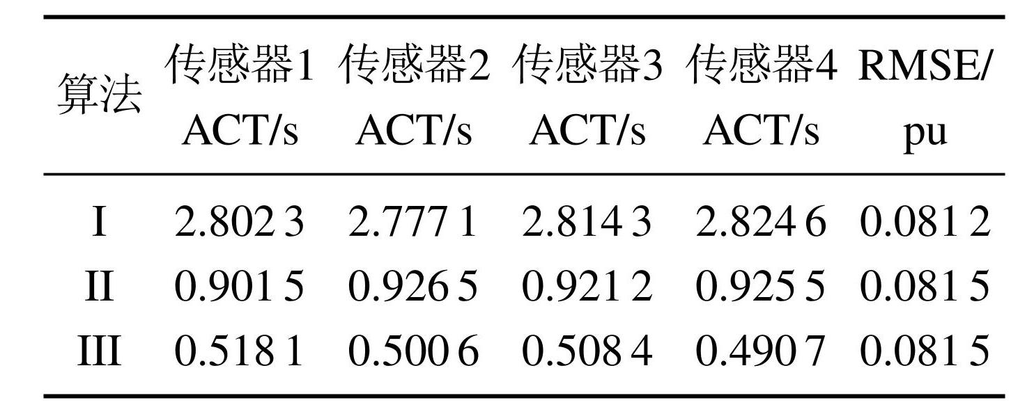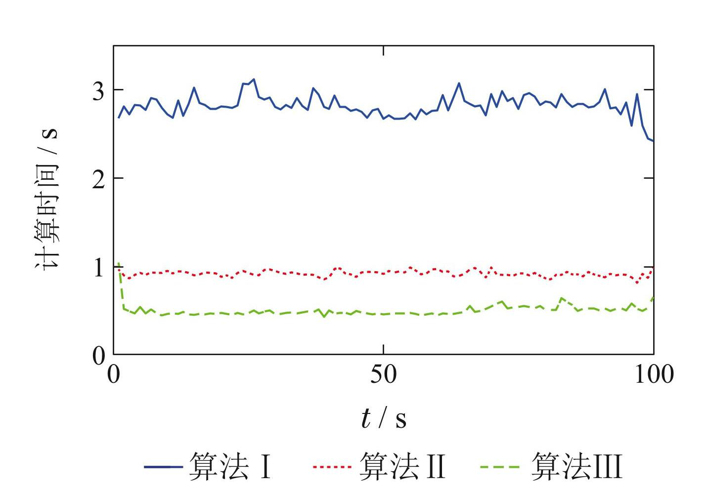 进一步对3种算法所需计算时间以及估计性能进行对比. 如图7所示为3种算法的平均计算时间对比,如表4所示为3种算法下状态估计的RMSE以及各传感器节点的平均计算时间(average computing time,ACT)对比. 从表4中数据可以发现,轮询协议下基于不同分块形式的DMHE的平均估计误差相近. 通过对比表4中3种算法所需的平均计算时间,可以看出算法的计算时间受分块形式影响较大,其中算法I的计算时间最长,其次是算法II,而算法III最短. 这归因于不同扰动分块方法在每个估计时刻需求解的优化变量数量不同: 算法I需处理56个变量,算法II处理32个,而算法III仅需处理24个. 由此可以说明估计窗口中扰动分块数量越少,算法所需计算时间越短. 综合对比图7和表4,可以发现,本文所提算法与未分块的DMHE算法相比,能够在不影响估计效果的基础上有效缩短计算时间.