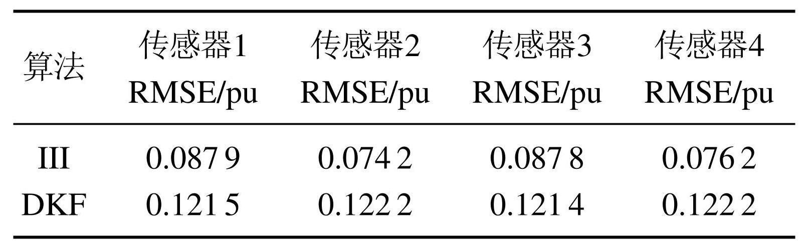 将算法III与文献 [33] 中分布式卡尔曼滤波(distributed Kalman filter,DKF)算法的估计性能进行比较. 文献 [33] 对各传感器节点的协方差矩阵执行共识策略,设计了DKF. 由于算法III需要在线求解有约束优化问题,这导致其在线计算量大于具有解析解的DKF.但DKF无法处理系统约束,相比于算法III,其估计精度有所下降. 表5为各个传感器节点基于算法III与 DKF的均方根误差对比,由表中数据可以看出算法III的RMSE值均小于DKF,这说明与DKF相比,算法 III在处理有约束微网系统的状态估计问题时,具有更高的估计准确度.