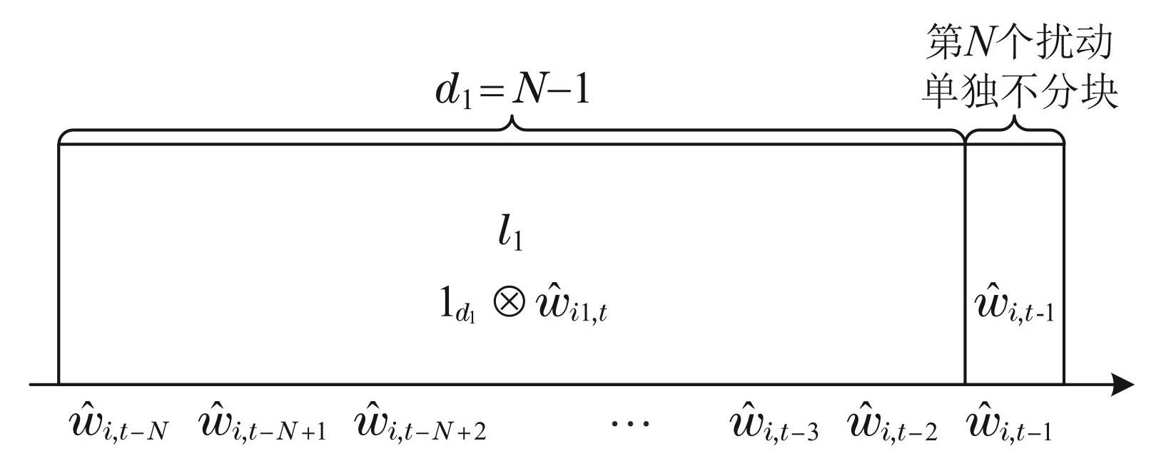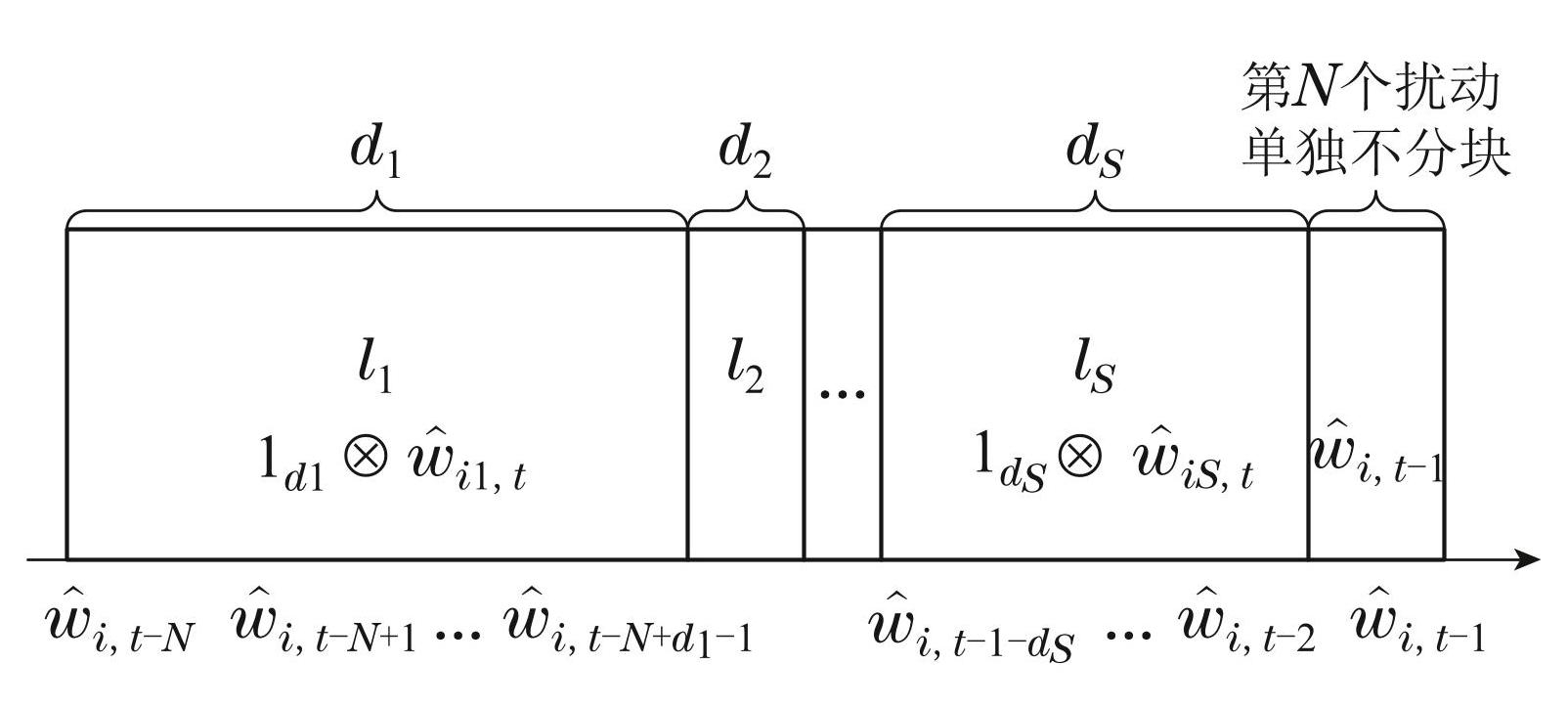 考虑估计窗口长度为 N,针对传感器节点 i ∈ E,t >N时刻滚动时域估计窗口内基于块结构的扰动序列示意图如图2所示. 其中: 估计窗口内前N − 1个扰动分块个数为 S,每块内扰动值相等,第 N块扰动单独分块; 为估计窗口内第m 个扰动块,dm 为lm 包含的扰动数量,表示前S个扰动块内的扰动序列,为由dm 个1构成的行向量,为克罗内克积.