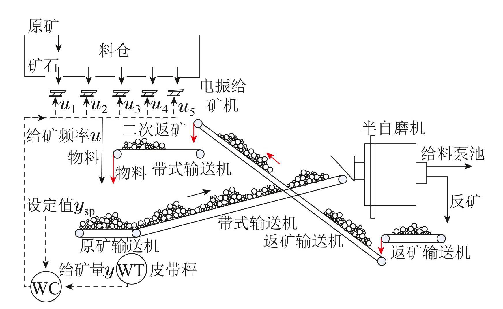 如图1所示,给矿过程由料仓、5台电磁给矿机、返矿输送机、皮带输送机、皮带秤、半自磨机等组成. 原矿经过简单破碎送往矿仓,仓内矿石经下方的5台电磁给矿机落至皮带输送机,电磁给矿机采用人工切换方式工作,皮带输送机将矿石送往半自磨机进行研磨,研磨后粒度合格的矿石送至给料泵池,进入下一道工序,不合格的矿石经返矿输送机传回进行二次研磨. 给矿过程的输入量为给矿机的频率,输出量为皮带机的矿石输送量. 图1中,WC表示给矿控制器,WT 表示皮带秤. WC用于控制给矿机的频率,WT用于测量皮带机的矿石输送量.