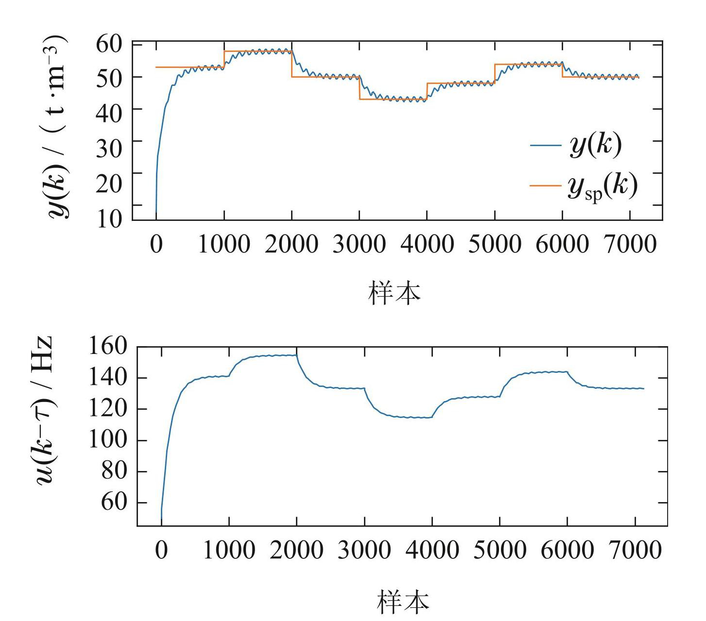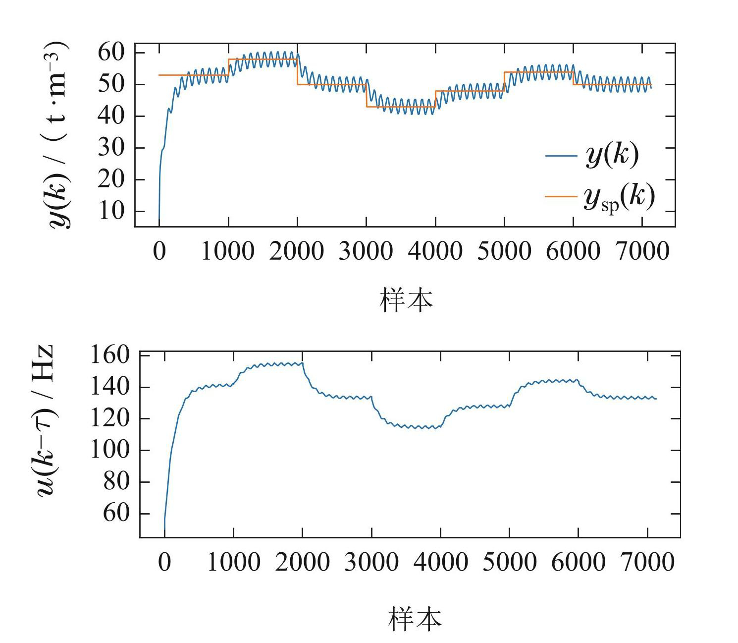 Fig.12The curves of feeding amount y (k) and frequency u (k − τ) when using the algorithm in this article