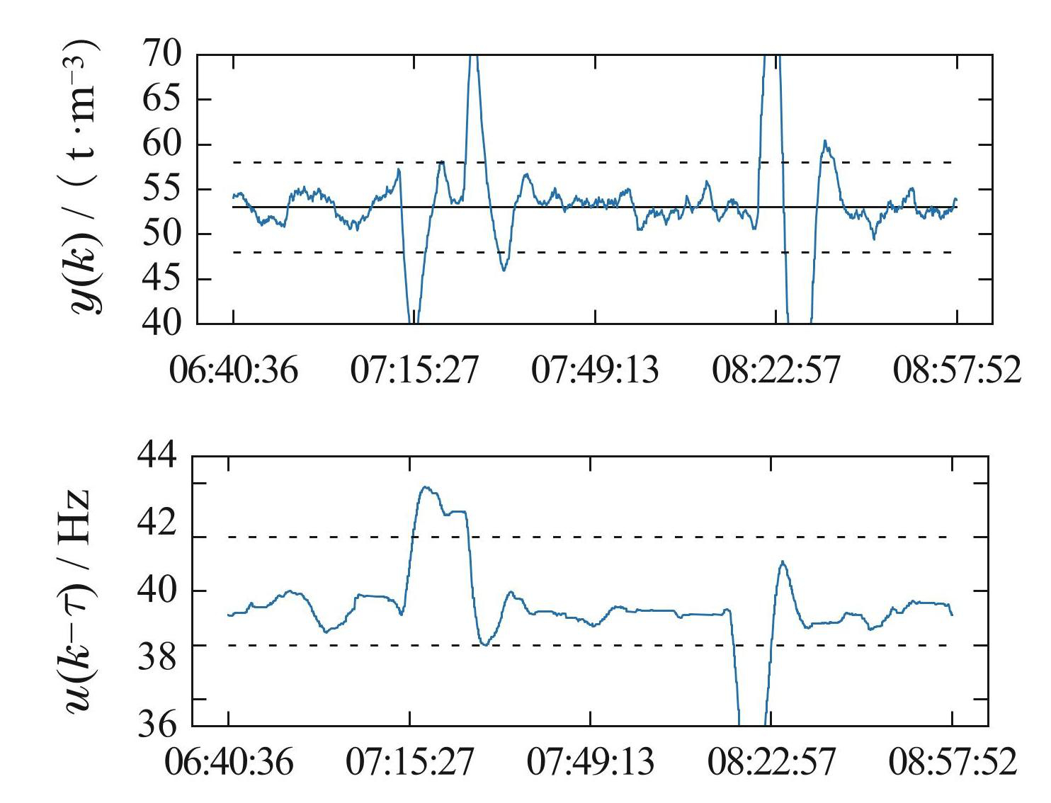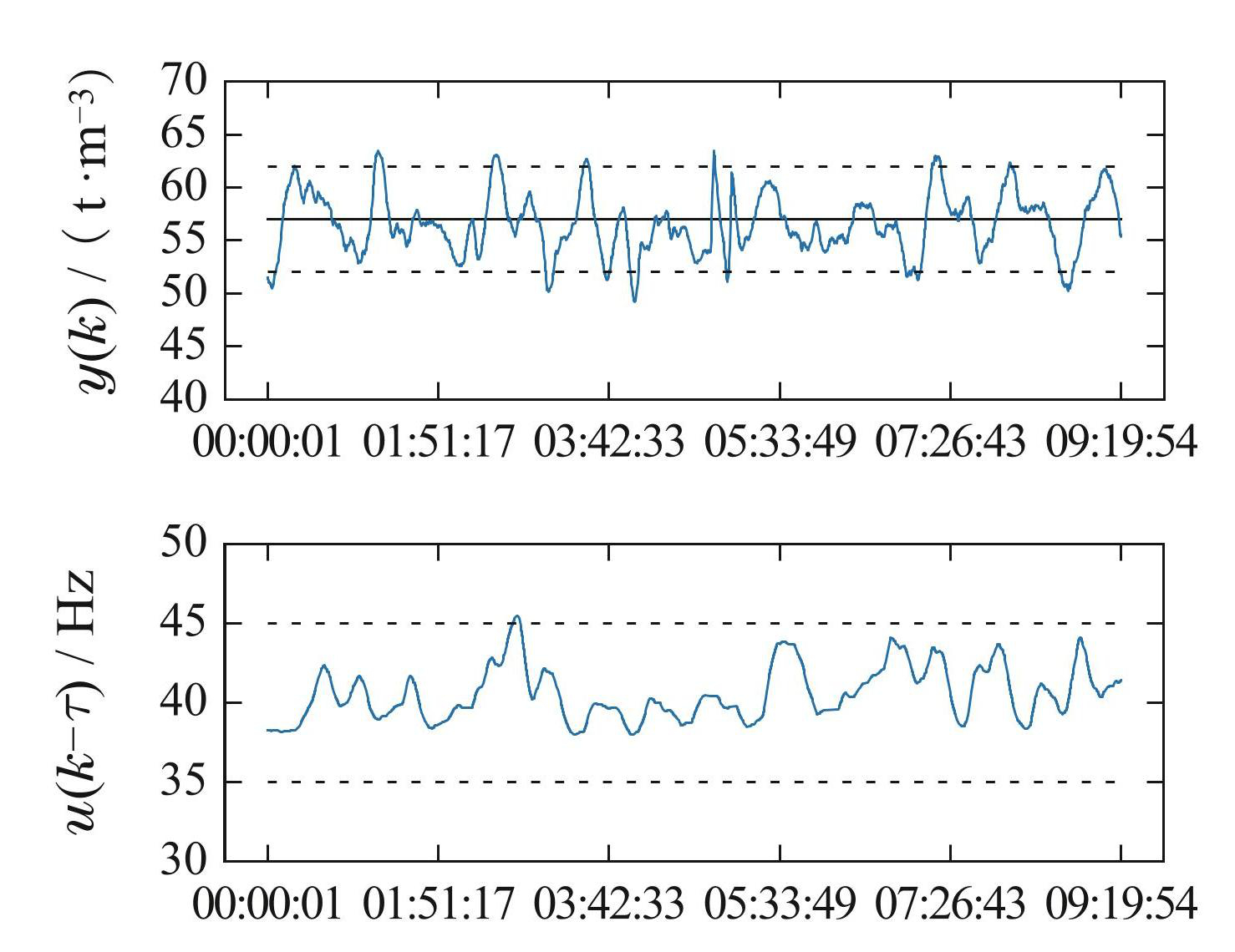 图12采用本文算法时的给矿量y(k)和频率u(k − τ)曲线