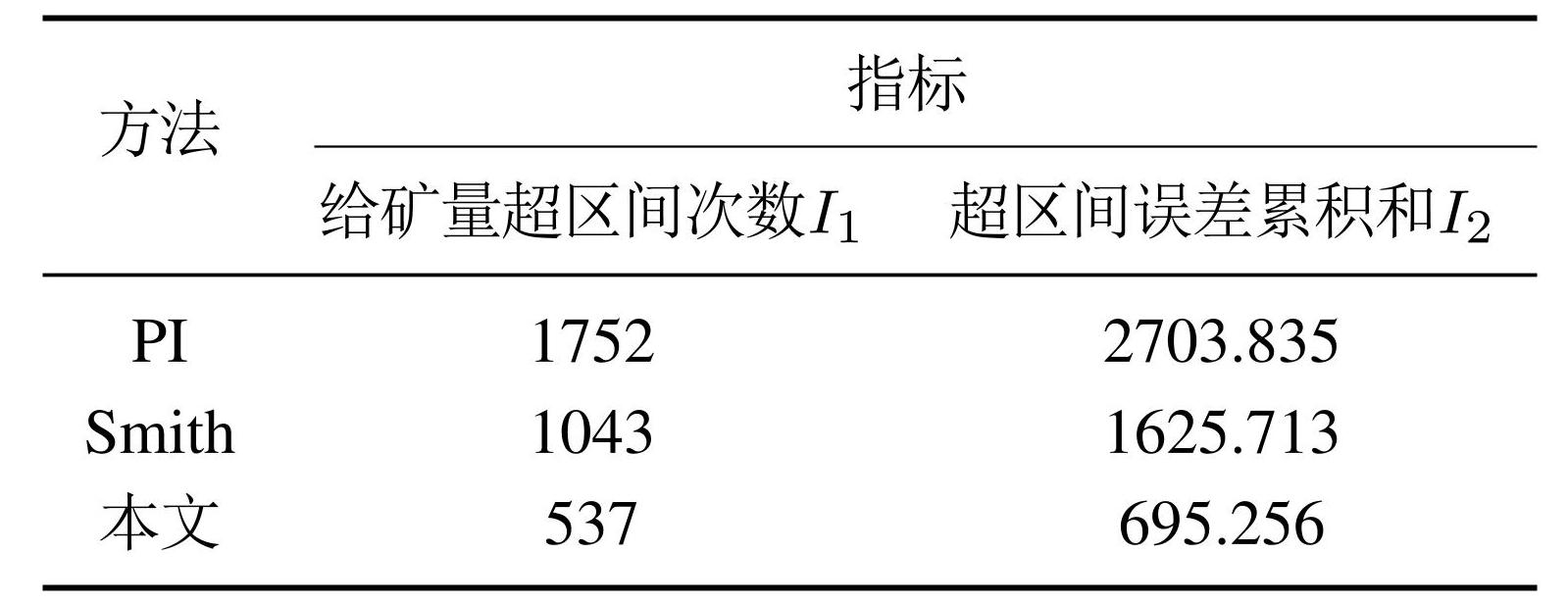 采用文献 [23-26] 的性能指标: 给矿量跟踪误差超目标区间次数I1、超区间累积和I2、控制输入超目标区间次数I3、超区间累积和I4、均方误差(mean squared error,MSE)、误差绝对值积分(integral of absoluted error,IAE),对上述3种方法的控制性能进行评价,评价结果如表2–4 所示.