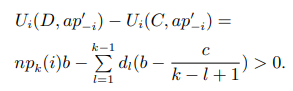 3)当期望为当ai为最佳响应时,则有AUi . 当−ai 为最佳响应时,假设 ai = C,则有则SISC(i)>0,这与条件相悖,此情况不存在,假设ai = D,一定有Ui <AUi .