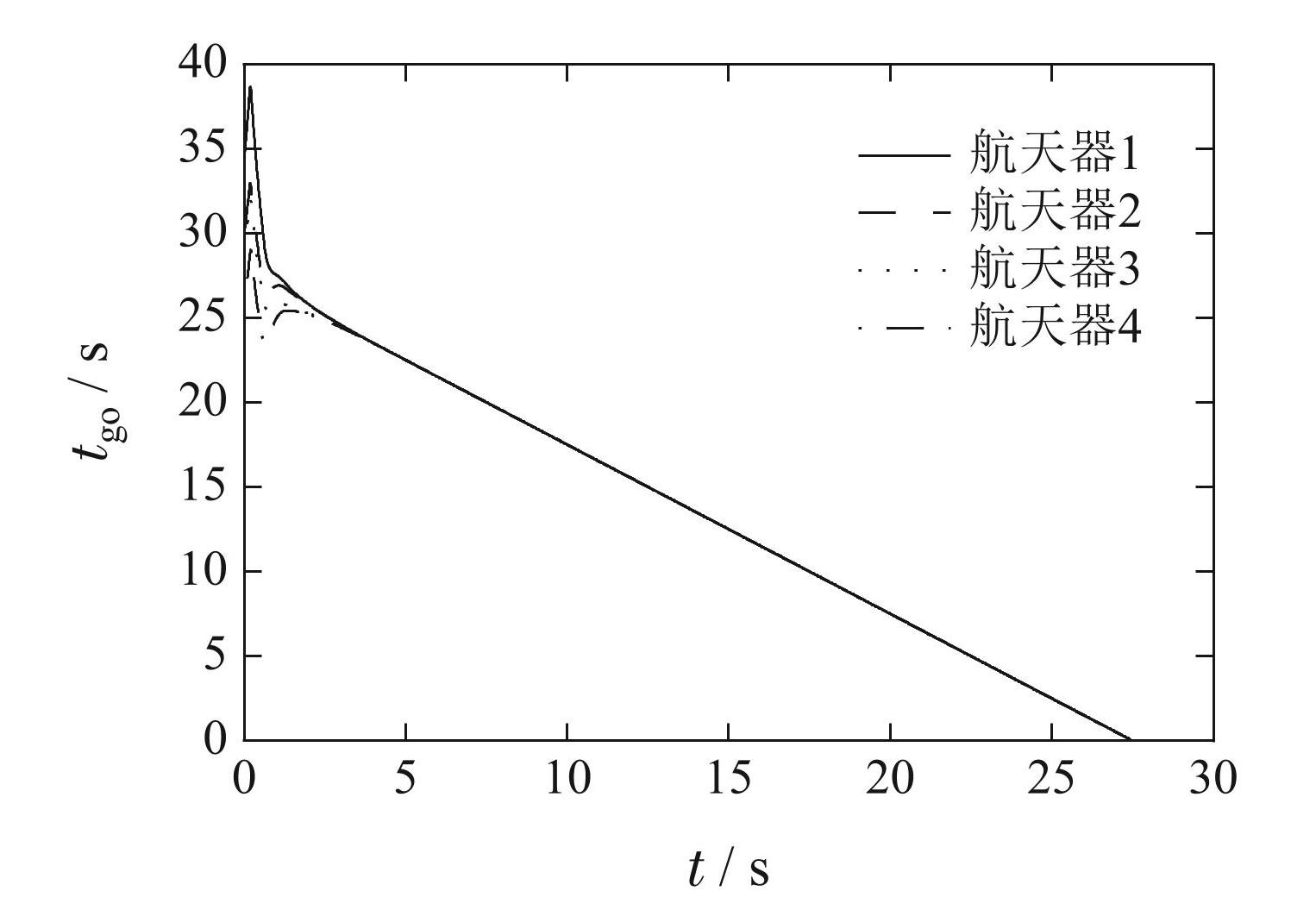 设航天器编号用角标i表示,i = 1,· · ·,n. 对沿视线方向加速度进行设计,使得每个航天器的剩余飞行时间趋于一致,从而实现时间一致性约束. 航天器i 的剩余飞行时间tgo,i为