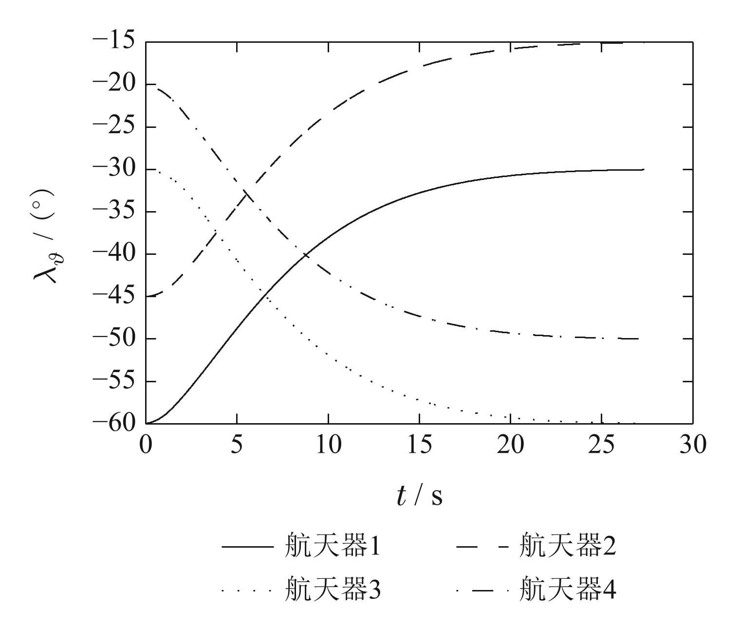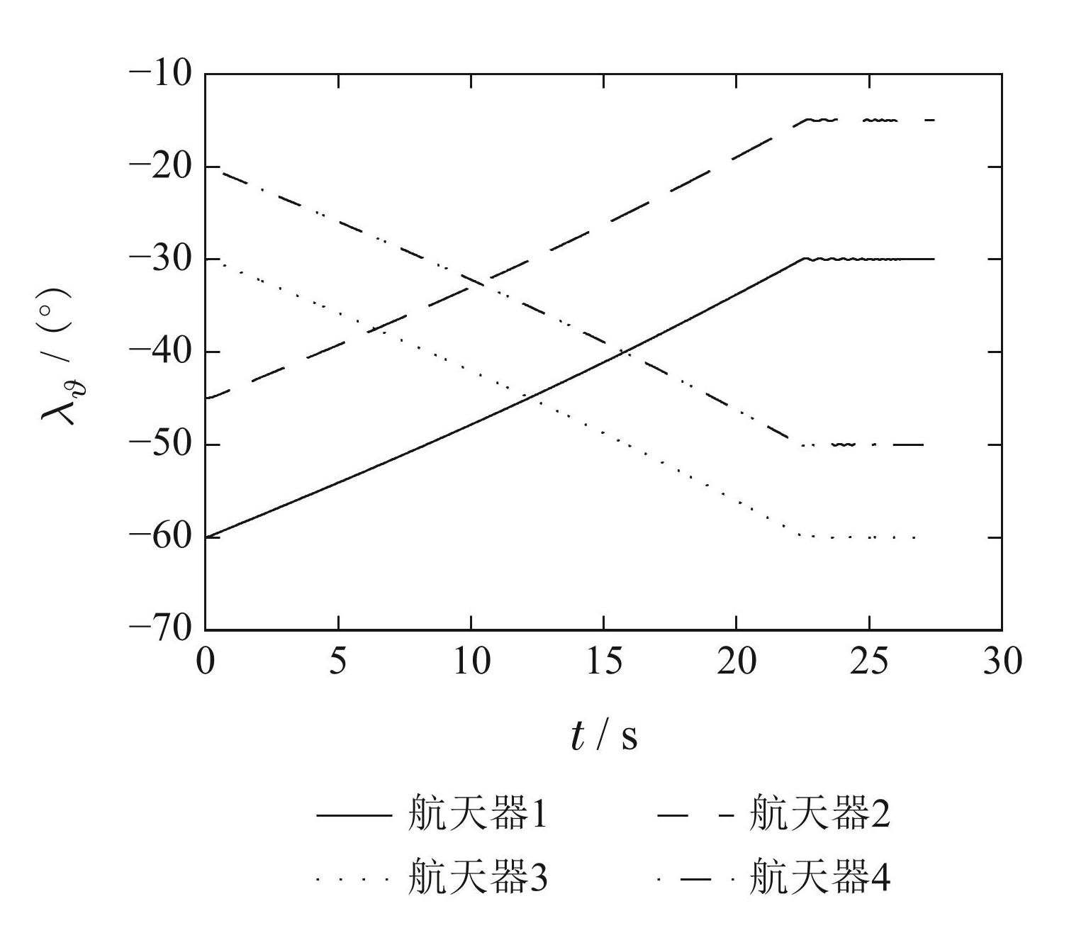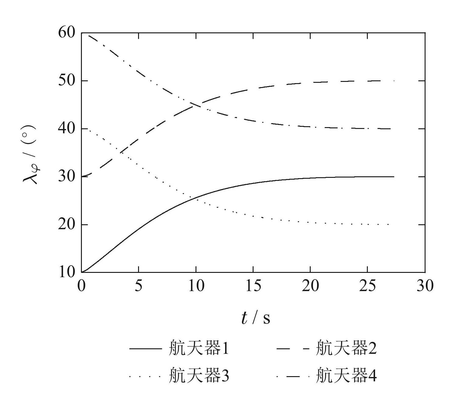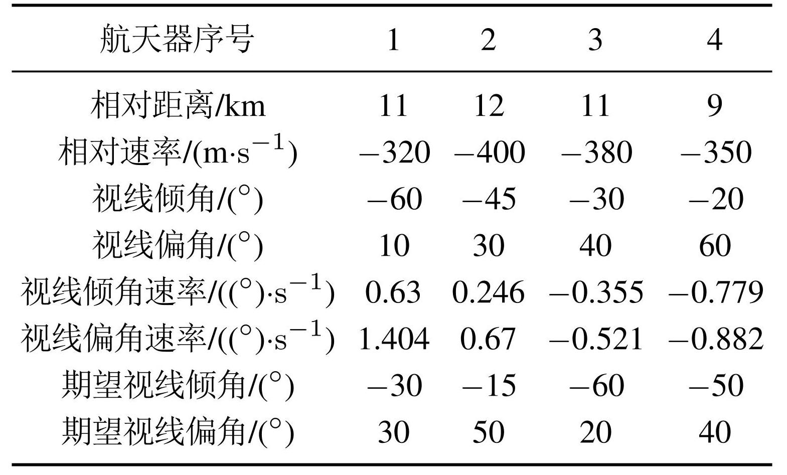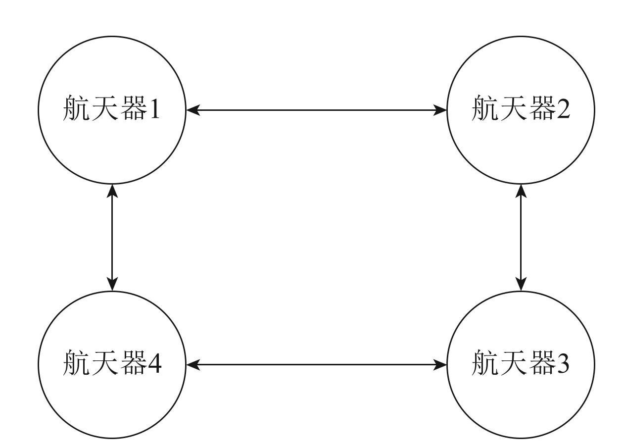 式中代表目标加速度沿发射坐标系3个轴的分量. 航天器的初始状态如表1所示.4个航天器的拓扑关系如图1所示. 仿真结果如图2–11所示.