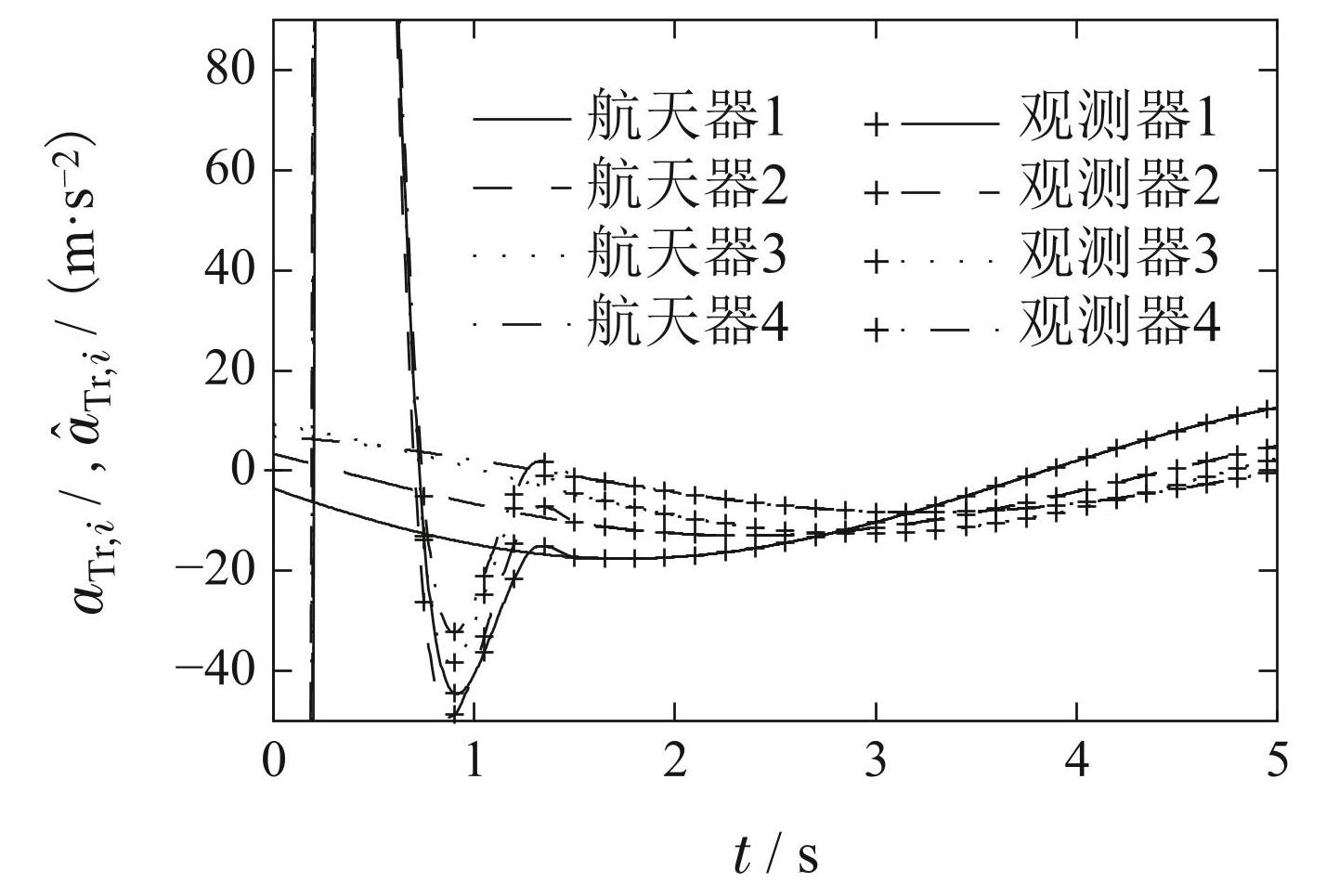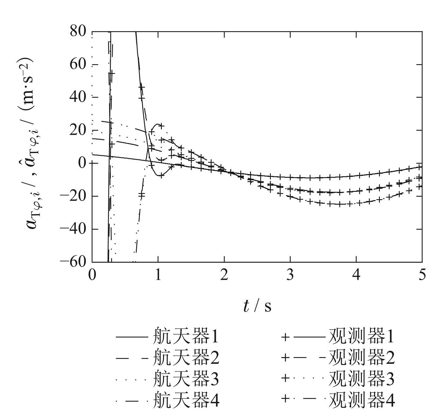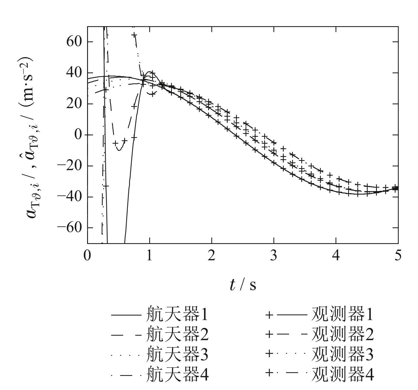 图3给出本文算法协同制导律的飞行轨迹,从图中可以看出4个航天器从不同的初始状态出发,均能够命中目标. 图4表示本文算法4个航天器的剩余飞行时间,本文的协同制导算法能够实现多个航天器同时碰撞目标. 图5–6表示本文算法视线倾角和视线偏角的变化规律,能够收敛至期望值. 图7–8表示文献 [23] 算法视线倾角和视线偏角的变化规律,通过图5–8对比可知,本文算法的收敛速度快于文献 [23] 算法,在视线偏角中表现的更明显. 图9–11给出在各个航天器视线坐标系下目标加速度沿3个轴分量的真值和观测器的估计值,从仿真结果可以看出,均能收敛至对应的被观测变量