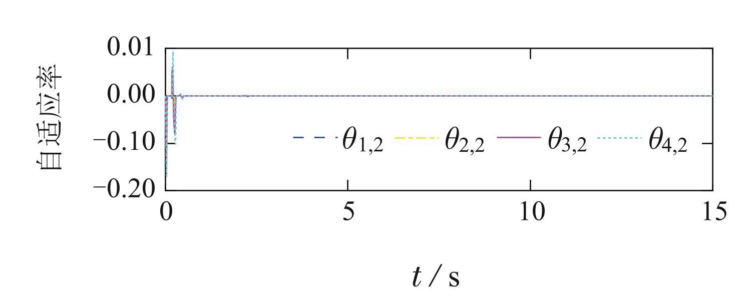 仿真结果如图1–10所示,其中图1–9为在本文提出控制方案下的实验结果,图10为不考虑预设性能策略的对比实验.4辆跟随车的位置信息xi,1(i=1,2,3,4)和1辆领航车的位置信息xr,1如图1所示,根据车辆轨迹可以看出车辆之间在空间上不存在重叠,并且所有跟随车在预设时间T = 2 s内能够跟踪上领航车的信息. 图2为预设时间观测器的观测值和参考信号 xr,1的曲线,图3为观测误差曲线,根据图2和图3可以看出该观测器能够在规定时间T = 2 s内准确估计领航车的状态信息xr,1. 图4表示4辆跟随车的控制器. 图5–7分别为跟随车的自适应率图8为与执行器故障相关的自适应率图9为本文设计的带有预定性能的车辆队列系统跟踪误差,从图中可以看出跟踪误差包含在预先规定的性能函数范围内. 图10为不考虑预定性能的车辆队列系统跟踪误差,从图中可以看出在这种情况下跟踪误差较大且5 s 后误差偏离原点较大,跟踪性能较差. 通过图9和图10对比,设计的预设性能方案能够提升系统的瞬态和暂态性能进而使得跟踪误差较小,并且即使领航车的轨迹在不同时刻发生变化也不需要重新选择预设性能函数,因此可以得出结论,本文提出的控制方案具有优越性.