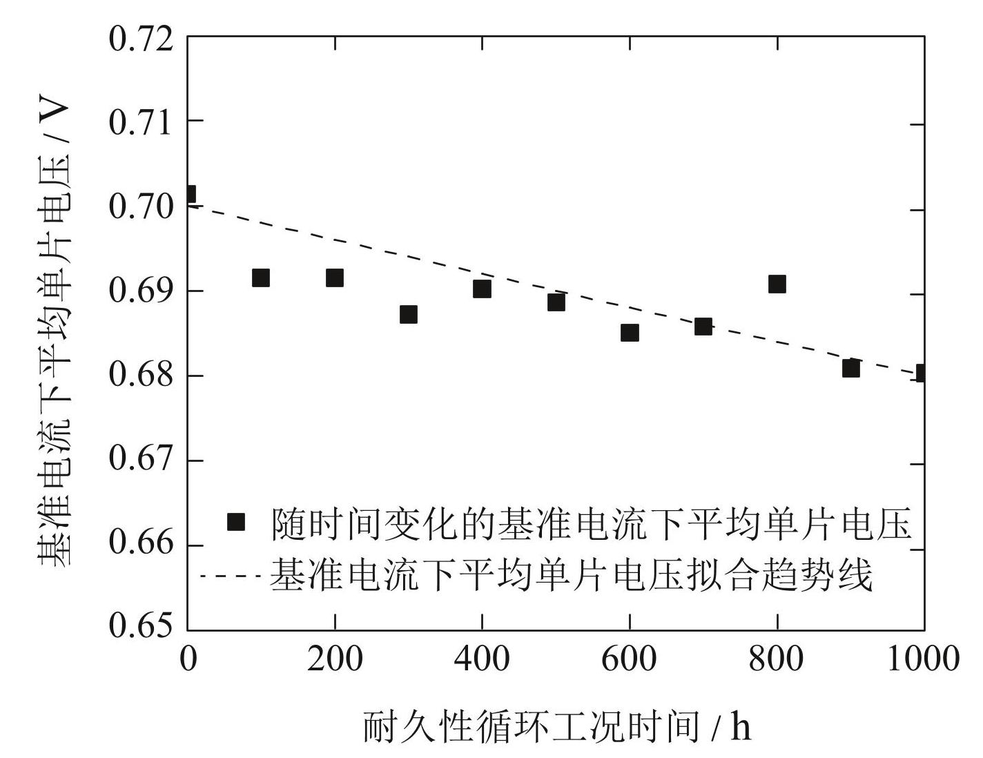 在耐久性评价过程中,对于燃料电池全生命周期性能衰减规律,研究人员常采用电压随运行时间的变化规律进行跟踪分析 [16-17] . 通过对同批次电堆按照指定运行工况进行提前测试可以获得单堆在该工况下全生命周期的电压变化规律,如图2所示.