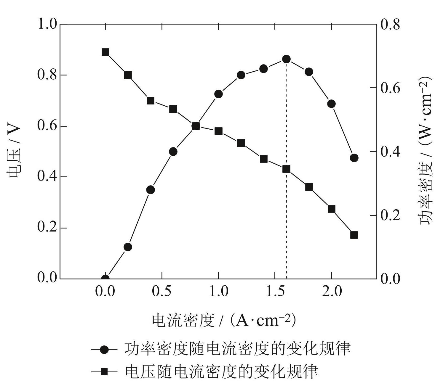 Fig.3Schematic of the voltage and power density changing with current density