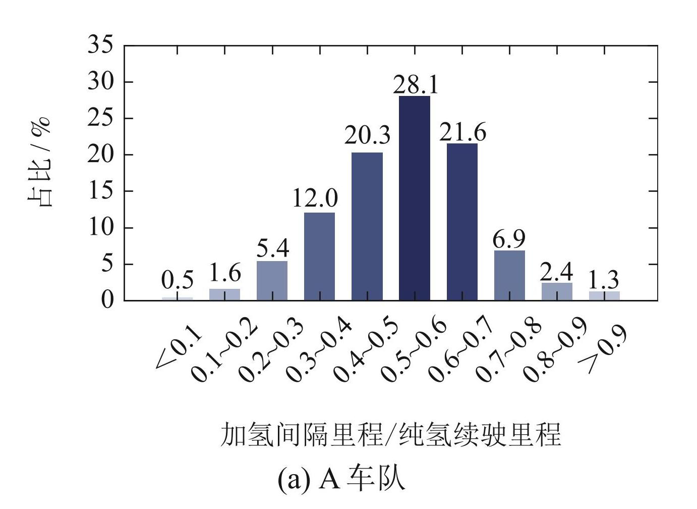 图3给出了车辆单次出行里程概率分布情况. 针对A车队,单次出行里程小于 30 km 的占比为 40.8%,单次出行里程为30∼60 km 的占比为25.4%. 针对B车队,单次出行里程小于30 km的占比为57.7%,单次出行里程为30∼60 km的占比为20.1%,单次出行里程超过120 km的占比为2.6%. 由此可见,A,B车队中单次出行里程小于90 km的总占比均达到80%以上,说明车队均以短途出行为主. 由于A,B车队所对应车辆的纯氢续驶里程分别为340 km与234 km,因此A车队在单次出行里程超过120 km的占比要高于B车队. 与此同时,经过计算得出,A,B车队中单次出行里程不超过50%,纯氢续驶里程的总占比达到95%以上.