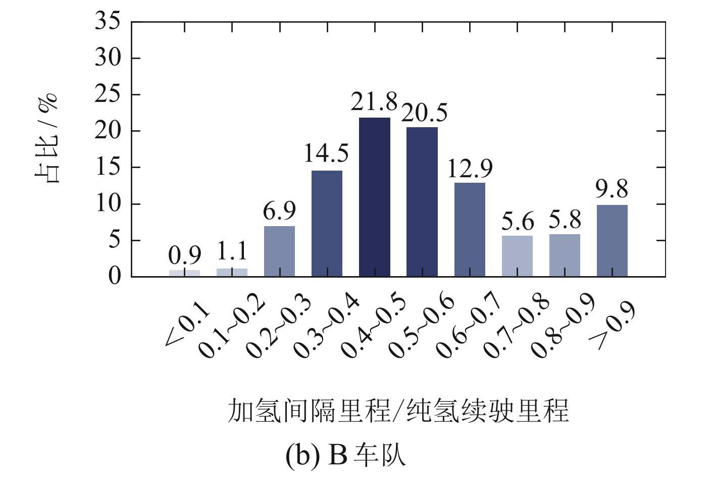 加氢特性对于燃料电池汽车而言尤为关键,包括加氢间隔里程、加氢间隔时间、加氢前后压强、加氢质量、平均氢耗等. 加氢间隔里程定义为车辆在两次加氢行为之间所产生的出行里程. 加氢间隔时间定义为两次加氢行为发生时刻之间相差的小时. 图5给出了车辆加氢间隔里程概率分布情况. 由于A,B车队所对应车辆的纯氢续驶里程差距较大,为了更准确的评估加氢规律,图5选择了加氢间隔里程与纯氢续驶里程的比值作为横坐标. 由图可见,A车队整体呈现正态分布规律,横坐标数值处于0.5∼0.6区间的占比最高,达到28.1%,横坐标数值超过0.8的占比约为 3.7%. B 车队中加氢间隔里程与纯氢续驶里程的比值超过0.8 的占比约为15.6%. 由于车辆加氢受到加氢站位置分布的影响,当前加氢站的基础设施未能很好实现示范应用城市群的全面覆盖,因此,车辆会较多地选择车载储氢瓶还有一定余量的时候进行加氢,确保车辆的持续运行.