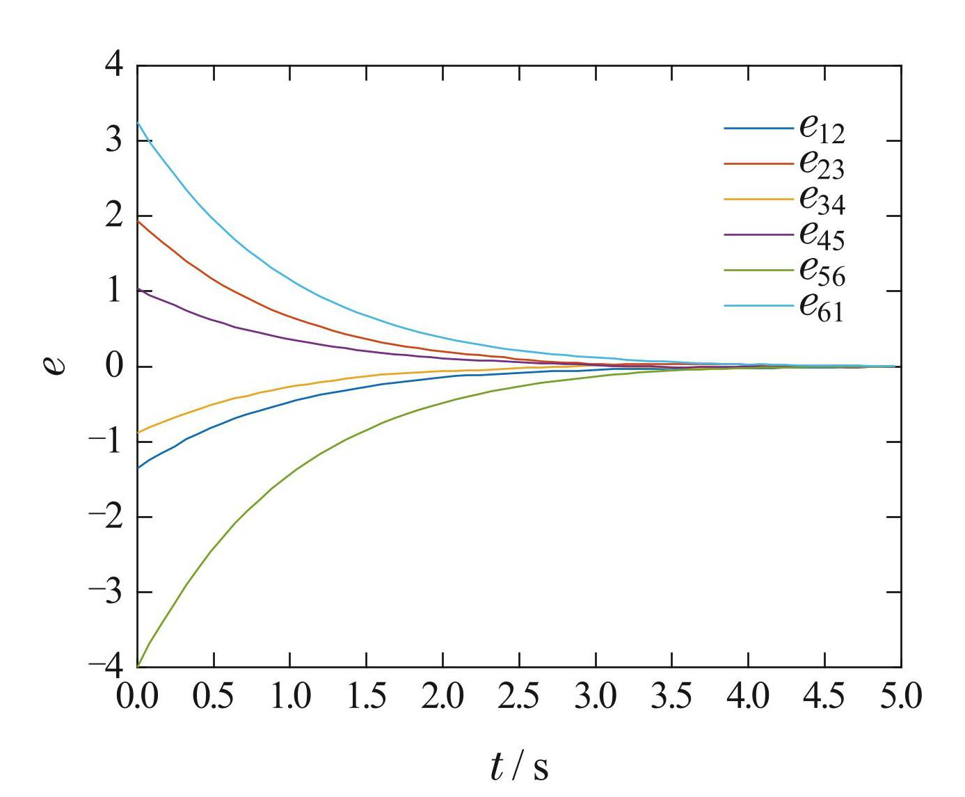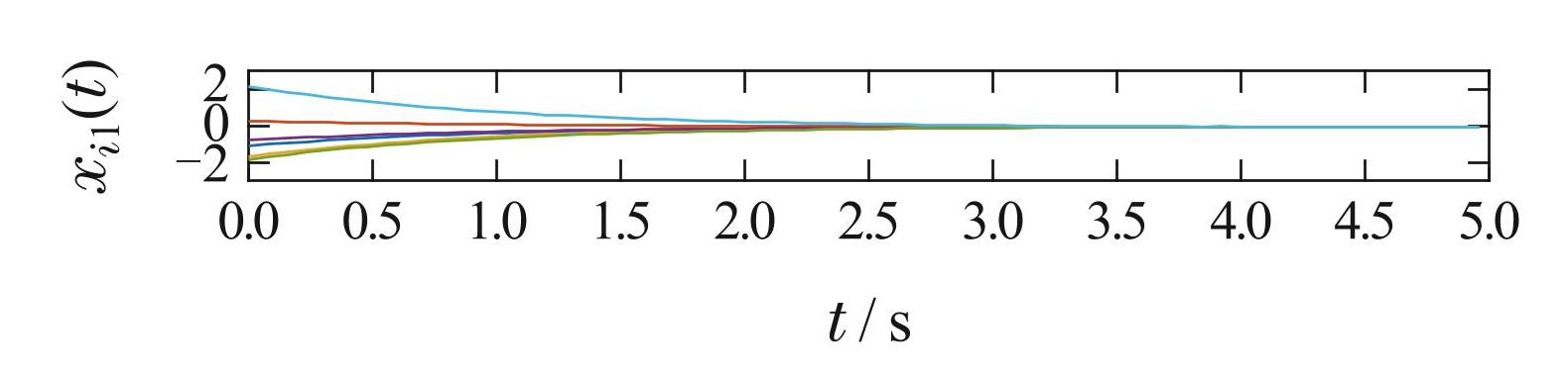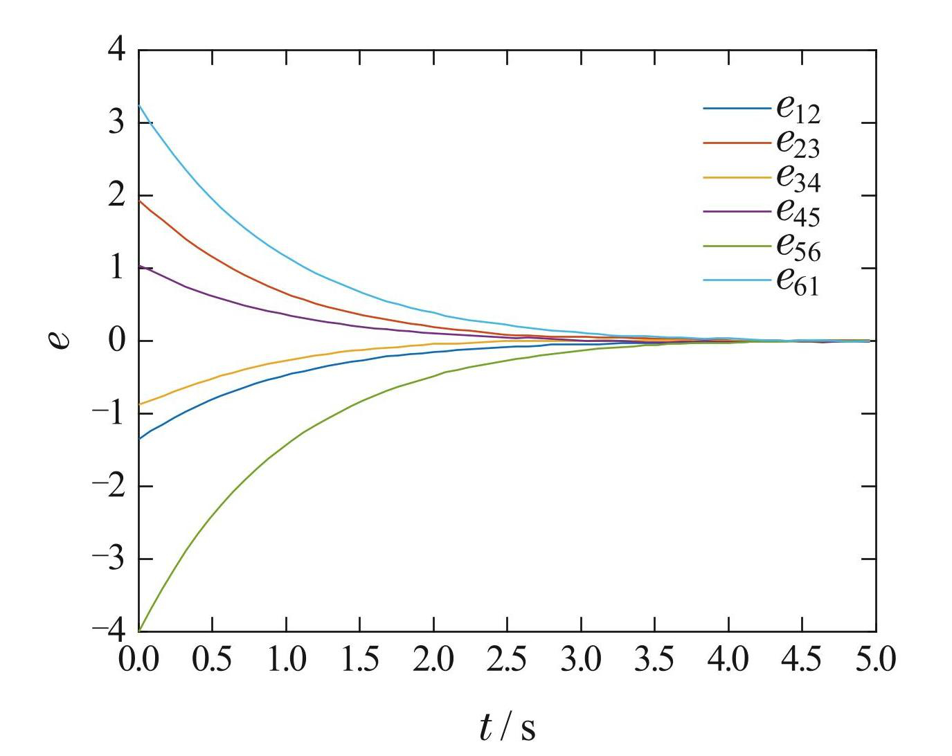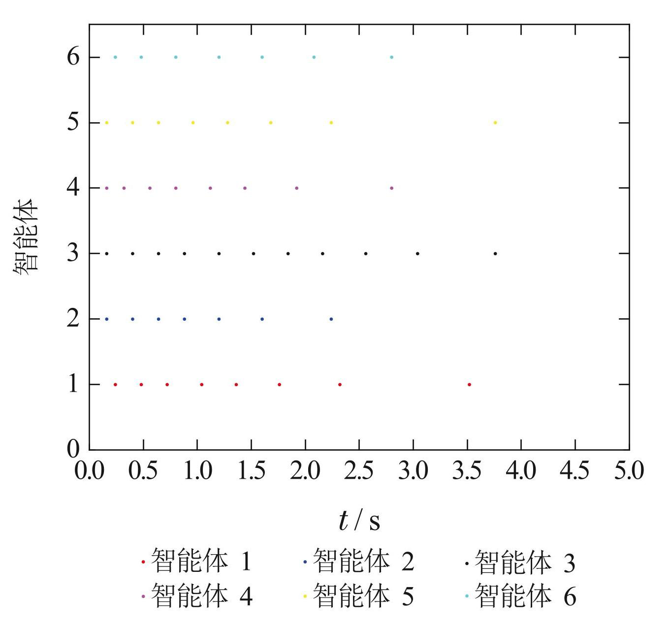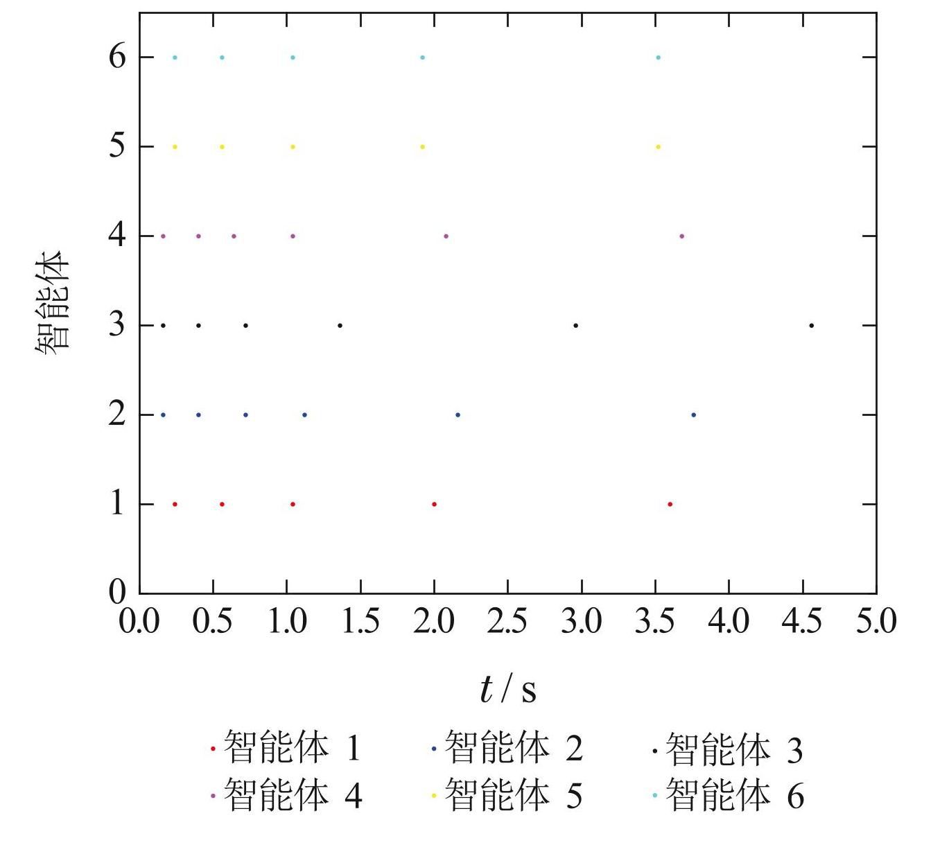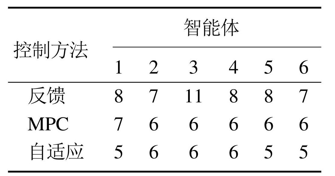 此外,本仿真系统所有智能体 θi = 65.235 8,πi = 0.002,βi = 0.05,δ = [1.5 2 2.5 2.5 1.8 1.7],Tp = 1.6 s,Q = I6×6,R = I3×3.
