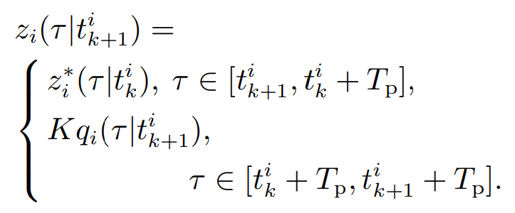 另外,需要注意式(15)的可用性,可通过选择合适的预测时域,来保证下一触发时刻这在触发机制(5)的设计中也可以体现出来,即当前时刻超出仍未满足触发条件时,则取