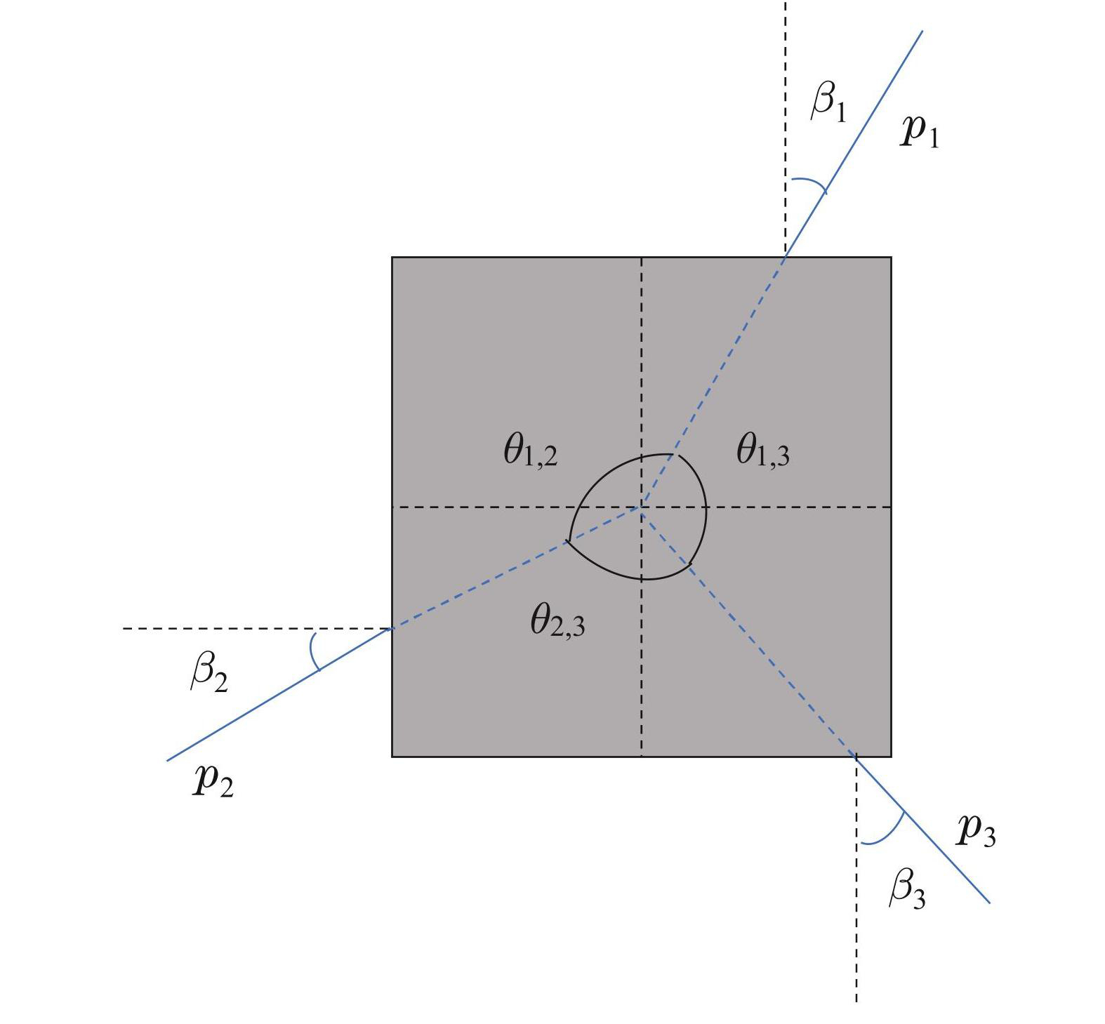进行精确抓取的前提是抓取点的计算,计算抓取点时所需参数如图3所示. p1,p2,p3为3个抓取点,包含位置和姿态信息; θ1,2,θ1,3,θ2,3是3个抓取点与物体中心连线的夹角; β1,β2,β3是连线与抓取面法线的夹角. 从被抓物体的角度出发,需要考虑两方面. 一是抓取点尽可能均匀分布,保持在120◦为佳,可使得物体受力均匀,从而,提高抓取的稳定性和可靠性. 二是抓取点的方向应尽可能与抓取平面的法线方向一致,这是为了最大化夹爪与被抓物体的接触面积,可更好地传递抓取力. 基于上述分析,本节设置360个抓取点,每个抓取点的方向指向物体中心以确保力的闭合,同时,构建如式(27)的基于最优抓取点的优化问题: