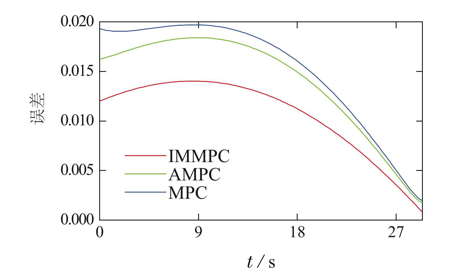 跟踪期望轨迹的第j个点时柔性夹爪末端的位姿为 ,当前跟踪点为 ,为了比较IMMPC,AMPC和MPC方法的性能,计算每根柔性夹爪末端的实际位姿与期望位姿之差,计算公式为式(30),同时,按照式(31)计算3根柔性夹爪的误差之和,3种方法的误差和曲线如图5所示.