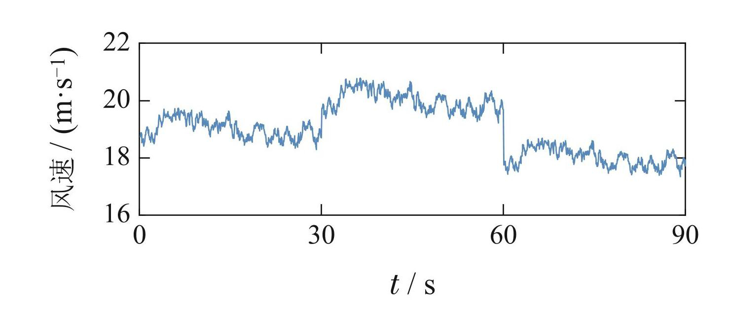 在低风速区域,平均风速在 30 s 时由8 m/s 降至 7 m/s,随后在 60 s 时攀升至 9 m/s. 风速扰动的标准差σ被设置为0.1 m/s. 生成的风速剖面如图2所示. 公式(7)中风速扰动vt的上界为α= 0.97.