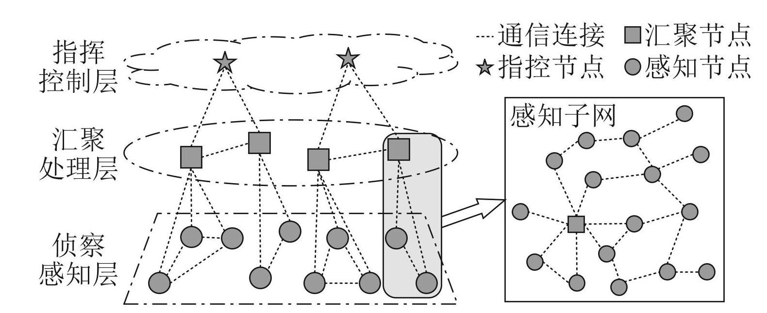 侦察网络是指为实现特定侦察探测任务,由具有侦察、汇聚、指控功能等多类型实体平台通过通信连接组成的,具有获取信息、处理信息、利用信息等完整功能的网络化整体,如用于目标跟踪、战场监视的无线传感器网络等. 传统侦察网络采用基于“传感器–指挥站”的信息链路模式,将指控平台与侦察平台直接进行串联,这种模式下的指挥控制系统要完成所有的信息处理、融合传递、指控命令的产生与传递等多项任务,难以满足现代战争中信息存在的大容量、快速率、高实时性等要求. 为解决上述问题,一种基于侦察信息价值增益的分层侦察网络模型被广泛应用,如图1所示. 该模型将传感器网络模型分为指挥控制层、汇聚处理层、以及侦察感知层. 感知节点主要负责收集信息,并将其转发到关联的汇聚节点; 汇聚节点从感知节点收集数据,并将其融合处理后发送至指控节点. 感知网是侦察网的子网络,由汇聚节点及其关联的感知节点构成. 侦察网络可视为多个感知网的有机组合,感知网之间通过汇聚节点进行通信. 感知网络的拆分部署可以降低侦察网络的复杂度,同时模块化设计可以有效提高网络的资源利用率与稳定性. 感知网的优化部署是侦察网络部署的重要环节,如何基于汇聚节点的部署位置,依据战场态势信息建立连通的感知网部署方案,是本文的研究重点.
