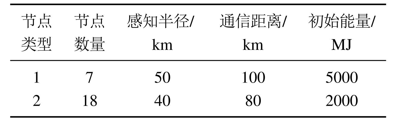 2)每个节点具有有限的初始能量,能量消耗完后节点功能失效. 战场感知节点通常是电池供电,特别是海战场这种感知面积广、补给不便捷的场景下,能量有限是普遍存在的情况,这一假设符合现实情况;