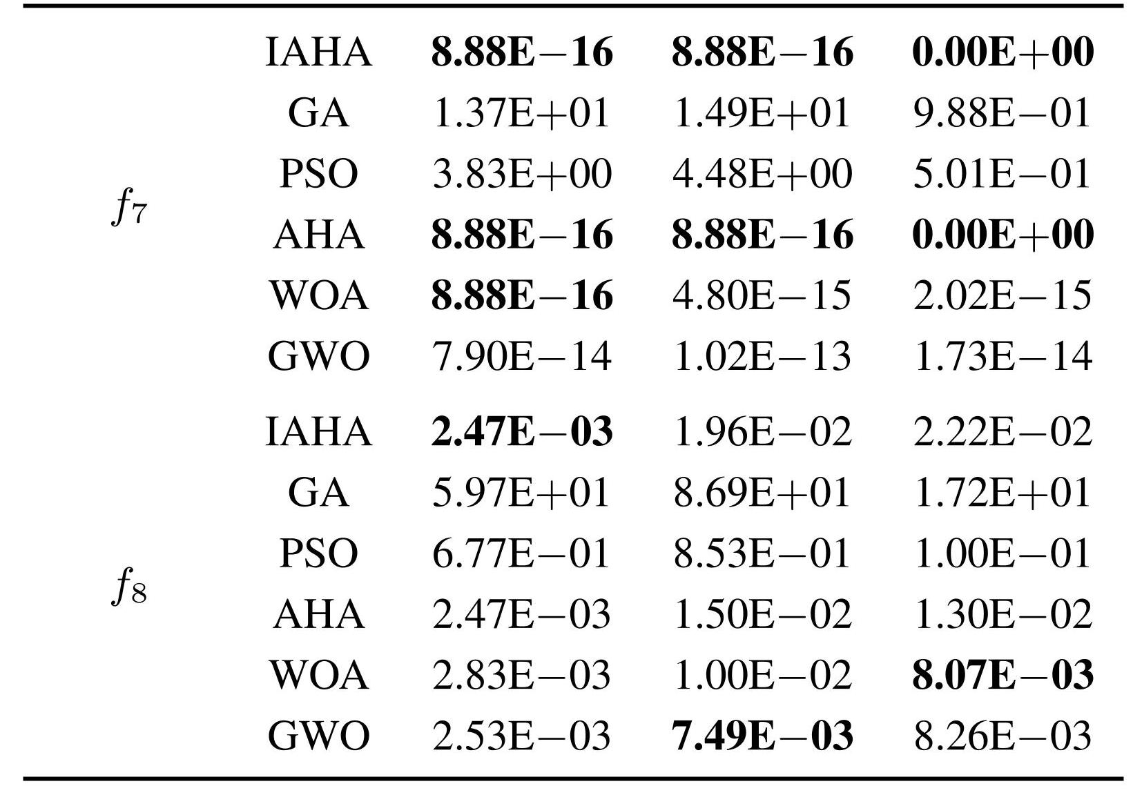 为测试改进算法的寻优性能,选用表4中的8个基准函数,对改进人工蜂鸟算法(IAHA)、遗传算法(genetic algorithm,GA)、粒子群算法(particle swarm optimization,PSO)、基础人工蜂鸟算法(AHA),以及近年来研究中常用的鲸鱼优化算法(whale optimization algorithm,WOA)、灰狼优化算法(grey wolf optimization,GWO)进行性能比较.