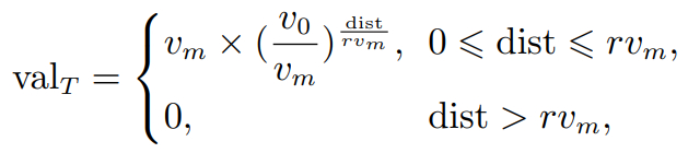 1)战场区域内存在 M 个目标节点,定义为 T = {T1,T2,· · ·,TM}. Tm(m = 1,2,· · ·,M)的位置为(txm,tym),在节点覆盖半径rvm内对战场子区域∆S 的侦察感知能耗valT(∆S,Tm)为
