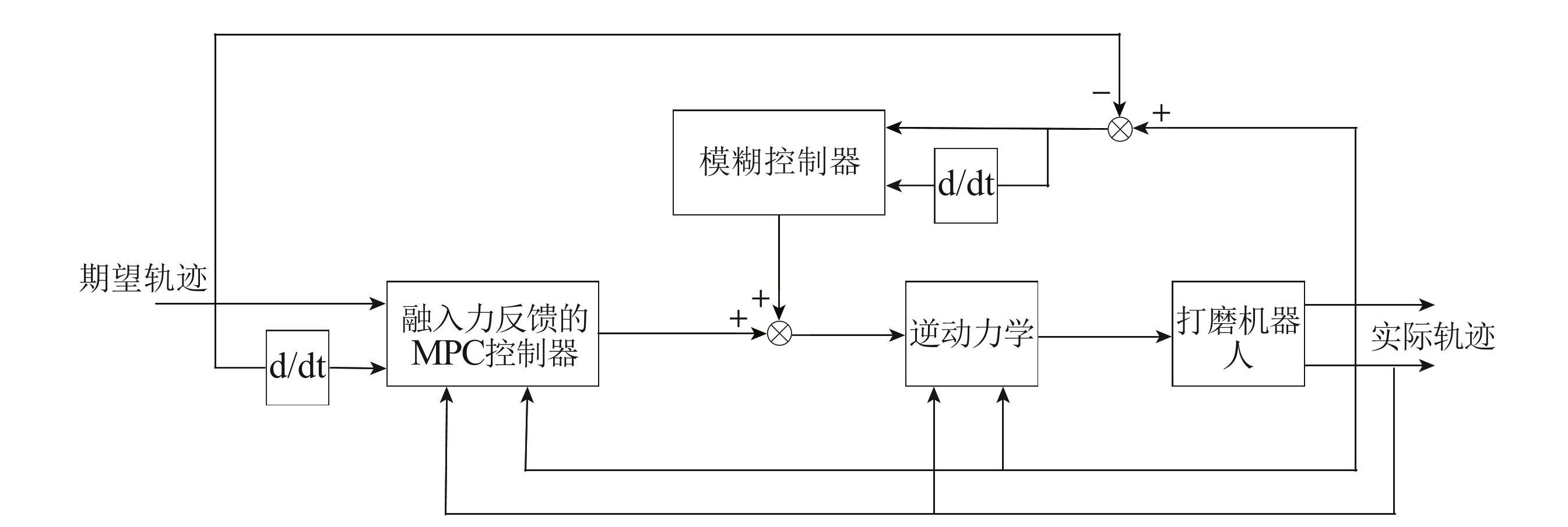 针对上述问题,本文提出了一种基于双层结构预测控制的打磨机器人动态轨迹规划方法,该方法可以在对打磨机器人进行轨迹规划的同时根据传感器返回的实时信息和相关约束对打磨轨迹进行优化,其中具有模糊补偿的预测控制框图如图1所示. 整体结构框图如图2所示.
