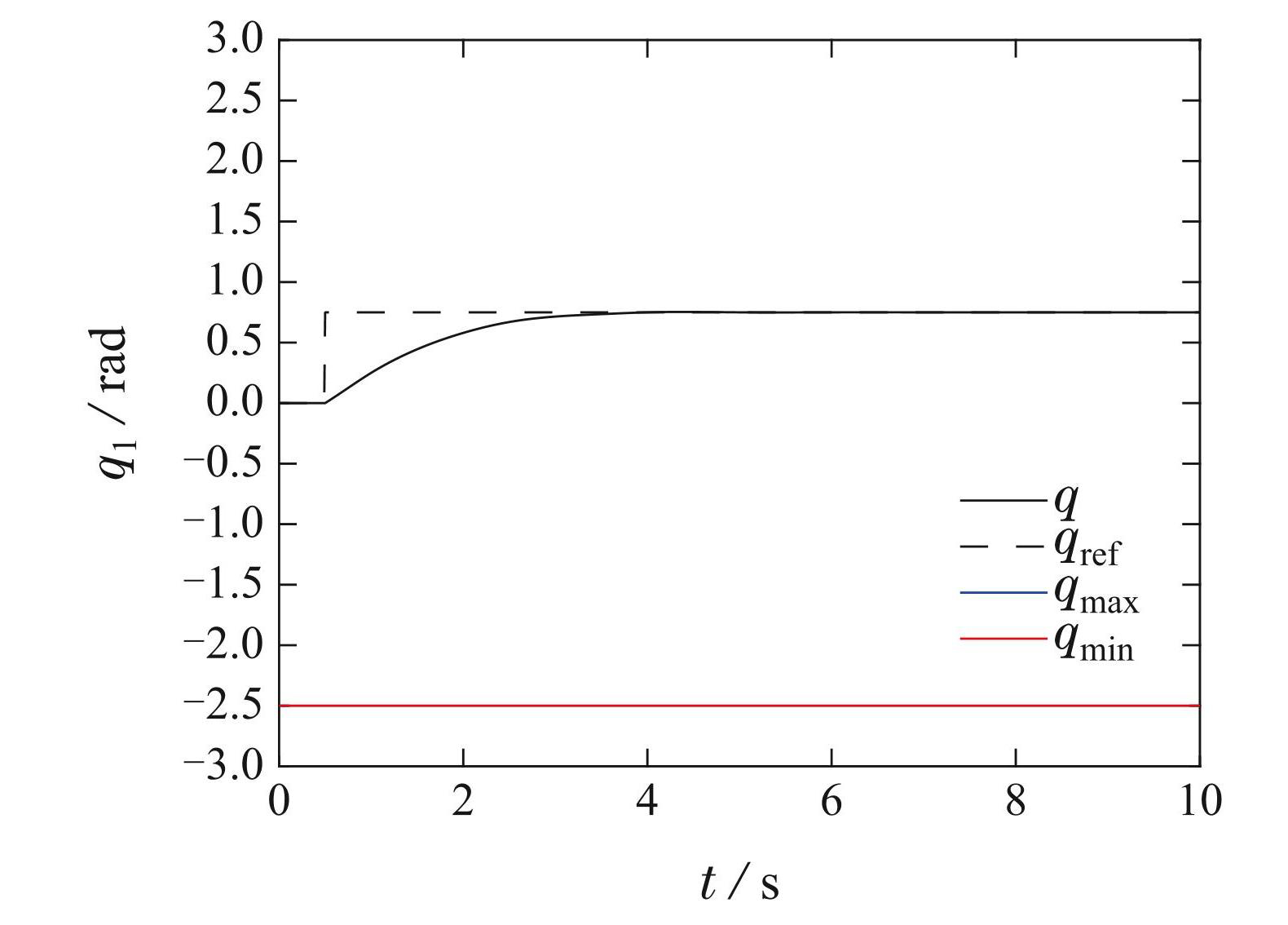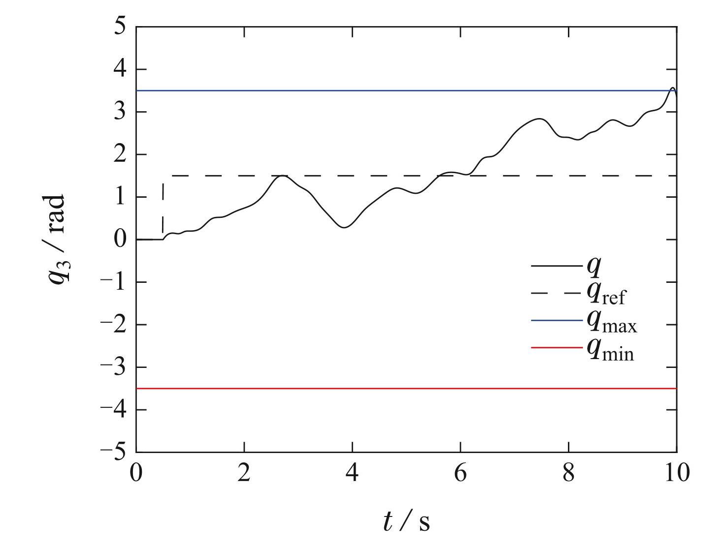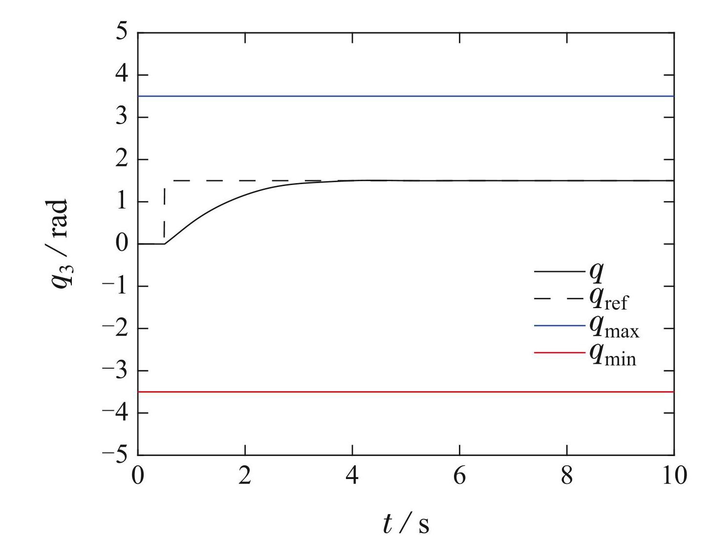 对于点与点之间,在仅使用MPC进行轨迹规划时,系统初始状态为qstart = [0 0 0]T,参考位置为qref = ,采样周期为T = 0.001 s,而MPC控制器的预测层数N = 10.3个关节的关节空间运动轨迹如图7–9所示.