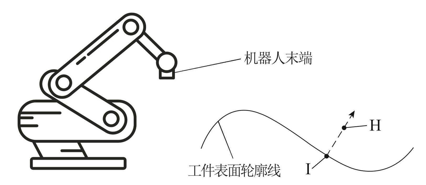 如图3所示,设工件上的打磨轨迹起始点为I,点H 在点I的外部且与I在同一条表面法线上,则打磨机器人末端靠近工件过程中末端的移动轨迹可以分为两个阶段:第1阶段为打磨机器人调整末端姿态并快速靠近点H的过程,第2阶段为打磨工具沿工件的表面法线方向贴合打磨轨迹起始点I的过程.