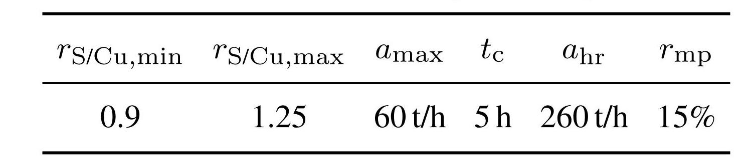 式中: ωS/Cu,min,ωS/Cu,max表示混合矿中硫铜比的最小值和最大值,ωS/Cu = {ωS,m/ωCu,m为混合矿中的硫铜比.